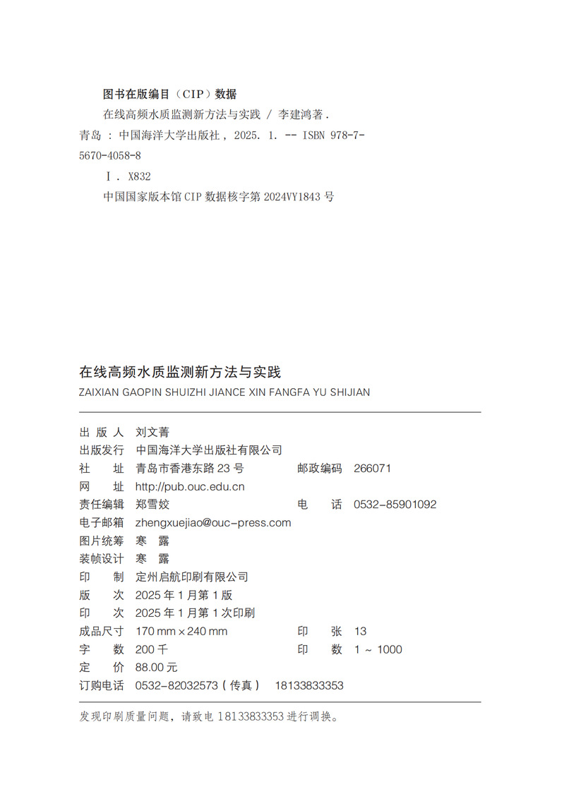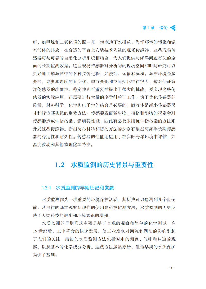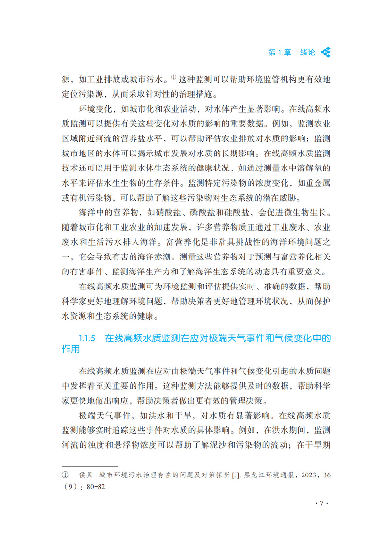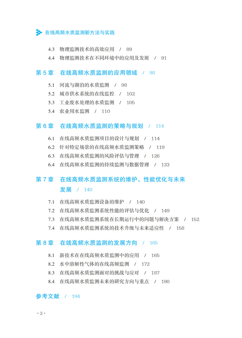 本书是一本全面深入探讨水质监测技术的专业书籍。该书从在线高频水质监测的基本概念入手,详细阐述了这一领域的发展历程和技术进步。全书共分为八个章节,每一章都系统地介绍了高频水质监测的关键方面,包括技术、设备、应用和未来趋势。在前两章中,作者详细介绍了在线高频水质监测的基本概念、历史背景、技术发展以及与传统方法的比较。接着,书中深入探讨了高频率监测技术的关键要素,如传感器技术、数据采集、监测系统的架构设计以及设备的校准和维护。第三章和第四章分别聚焦于化学和物理检测新方法。这些章节不仅介绍了最新的分析技术,还探讨了化学和物理传感器技术的发展,并提供了高效处理监测数据的方法。