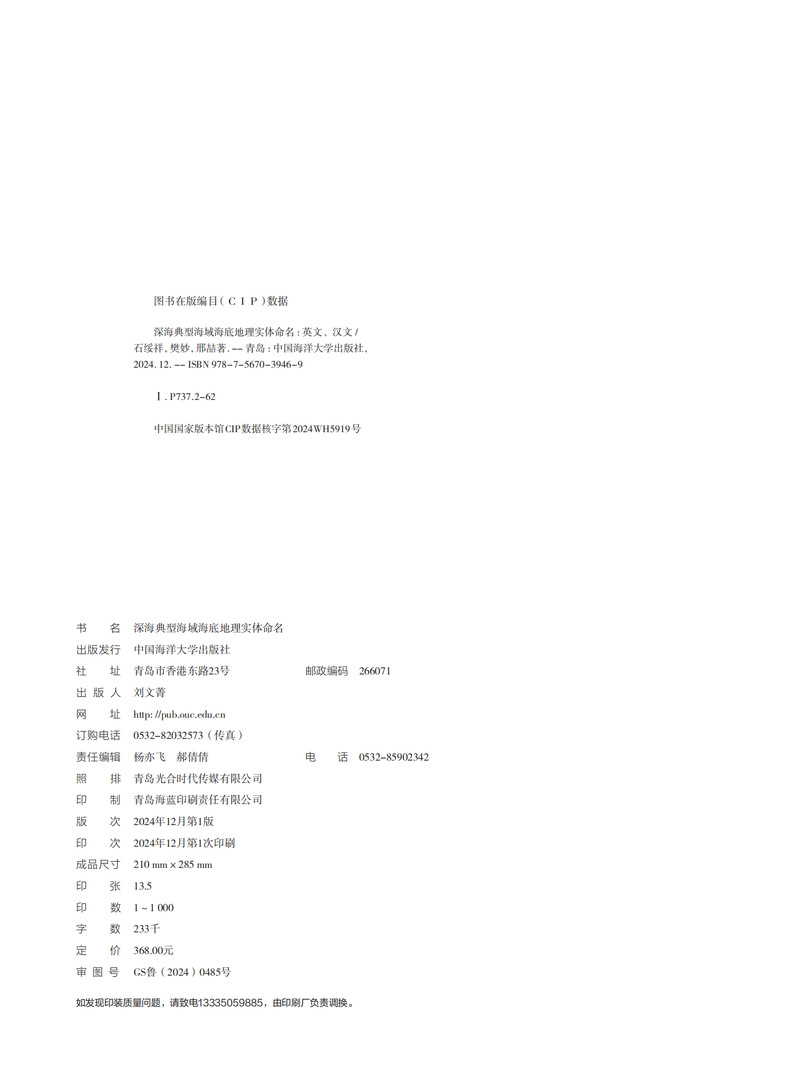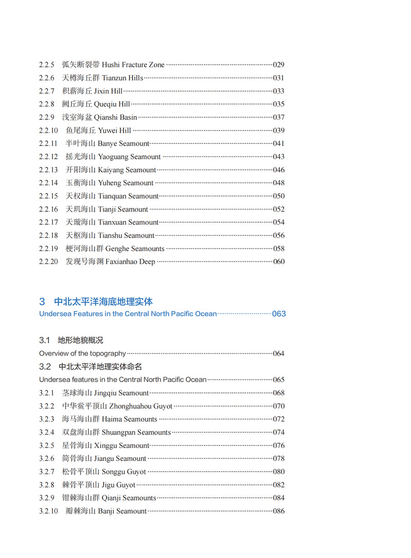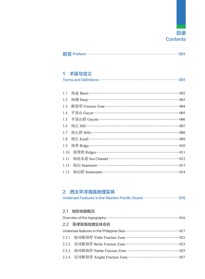 海底地理实体命名,是对海底地理实体经过科学判别和认定后对其进行标识和命名的过程。开展海底地理实体命名不仅是科学活动的一部分,更是维护海洋生态平衡和促进人类与自然和谐共处的重要手段。本书主要依托于近五年来的多波束水深调查资料,对其进行数据精细化处理、质量控制和精度评估,在满足海底地名命名要求的基础上,依据《国际海底地名命名规则 IHO B-6》、GB 29432-2012《 海底地名命名》,在充分吸纳、借鉴世界海底地名录及我国公布的海底地名的基础上,进行判读、提取和命名,是相关研究人员进行科研的工具性资料。
