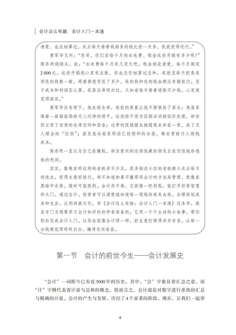 本书主要内容包括会计核算的基本理论和应用,分“会计是什么”“会计核算是什么——理论篇”“会计核算是什么——应用篇”“会计核算是什么——实操篇”4部分,共9章,围绕会计核算的方法,按照会计核算的流程,从理论、应用到实操层层展开。在知识点讲解的同时,还有“想一想”“你知道吗”“小课堂”“注意”等模块。作者通过生动有趣的小故事,引入和讲解会计的核心概念和原理,让读者在轻松愉快的阅读过程中,掌握会计的基本技能和方法,提高会计的素养和能力,目的在于为对会计感兴趣的零基础读者打开会计之门。