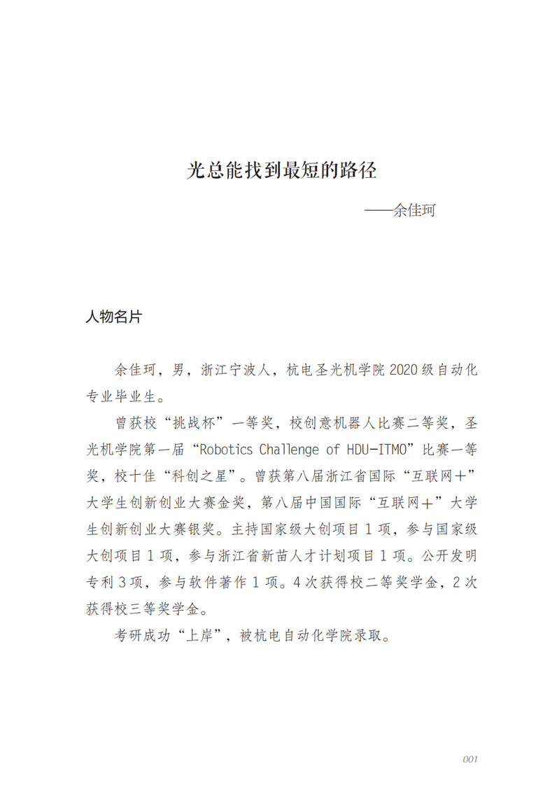 杭州电子科技大学圣光机学院办学时间不长,但在人才培养方面的独树一帜使得毕业生能在人才市场大放异彩,受到了社会的广泛认可。为了展现圣光机师生的风采和魅力,激励每个学子汲取精神力量,奋发有为,再创辉煌,此稿讲述了圣光机学院7个有代表性的优秀学子——余佳珂、黄向荣、许凯胜、高匡庸、易煊、岑滨斌、黄凡丁的故事。通过阅读此稿,读者不仅能鉴赏一个个精彩的故事,感受人物的思想、智慧以及人格魅力,更能遇见一段未能见识的人生,在对照中认识自我、激励自我、提升自我。