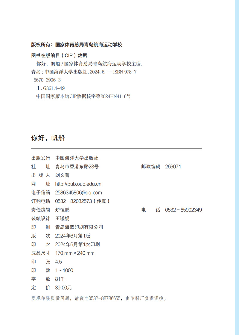 《你好,帆船》是国家体育总局青岛航海运动学校根据国家体育总局科普项目计划向青少年科普帆船运动编写的一本青少年帆船知识科普书籍。内容主要从了解帆船运动发展历程与基本知识为切入点,围绕“如何玩转帆船”“如何看懂帆船赛”为中心进行内容展开,并适当增加海洋环保相关内容,有趣的原创插画和知识游戏环节增添了本书的趣味性,是一本集专业性、趣味性、实用性极强的青少年科普书籍。通过本书,会使更多的青少年爱上帆船运动,爱上帆船航海。