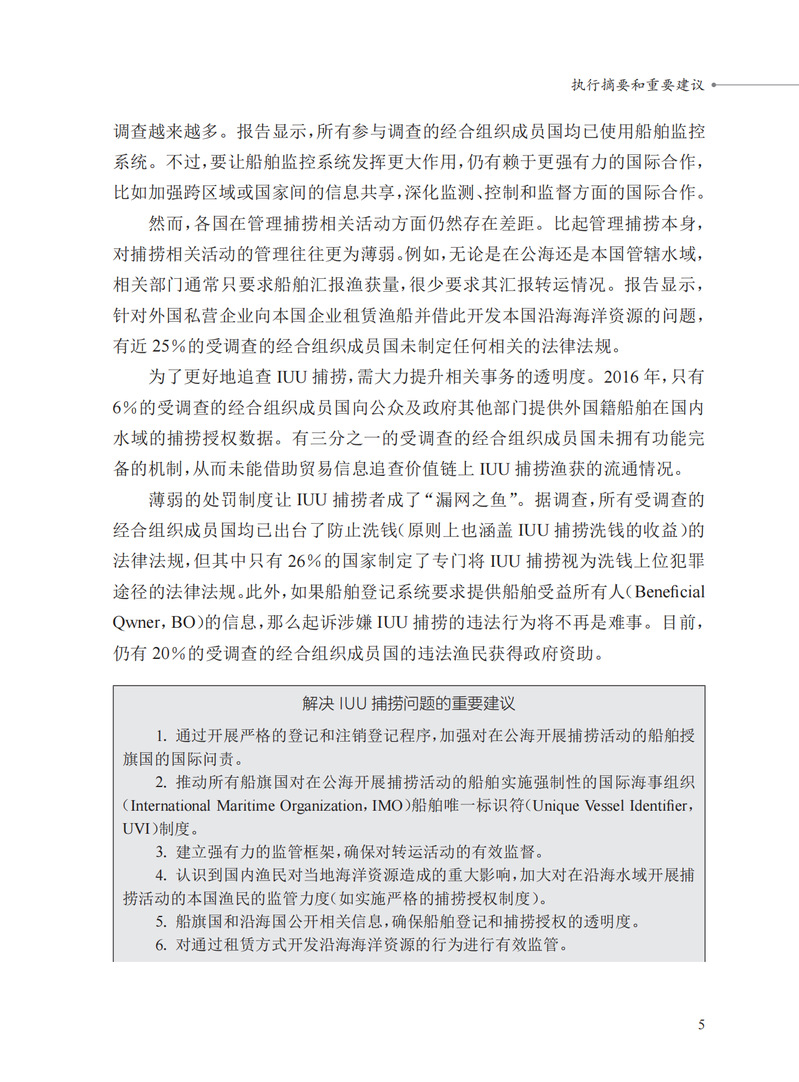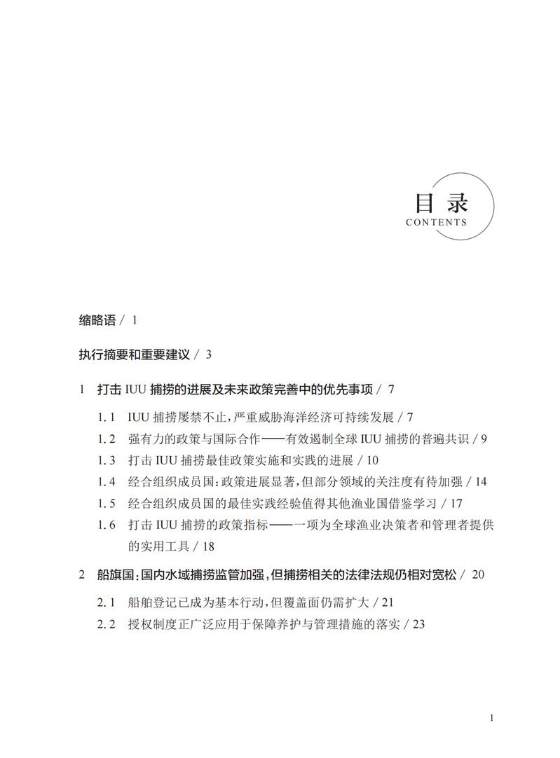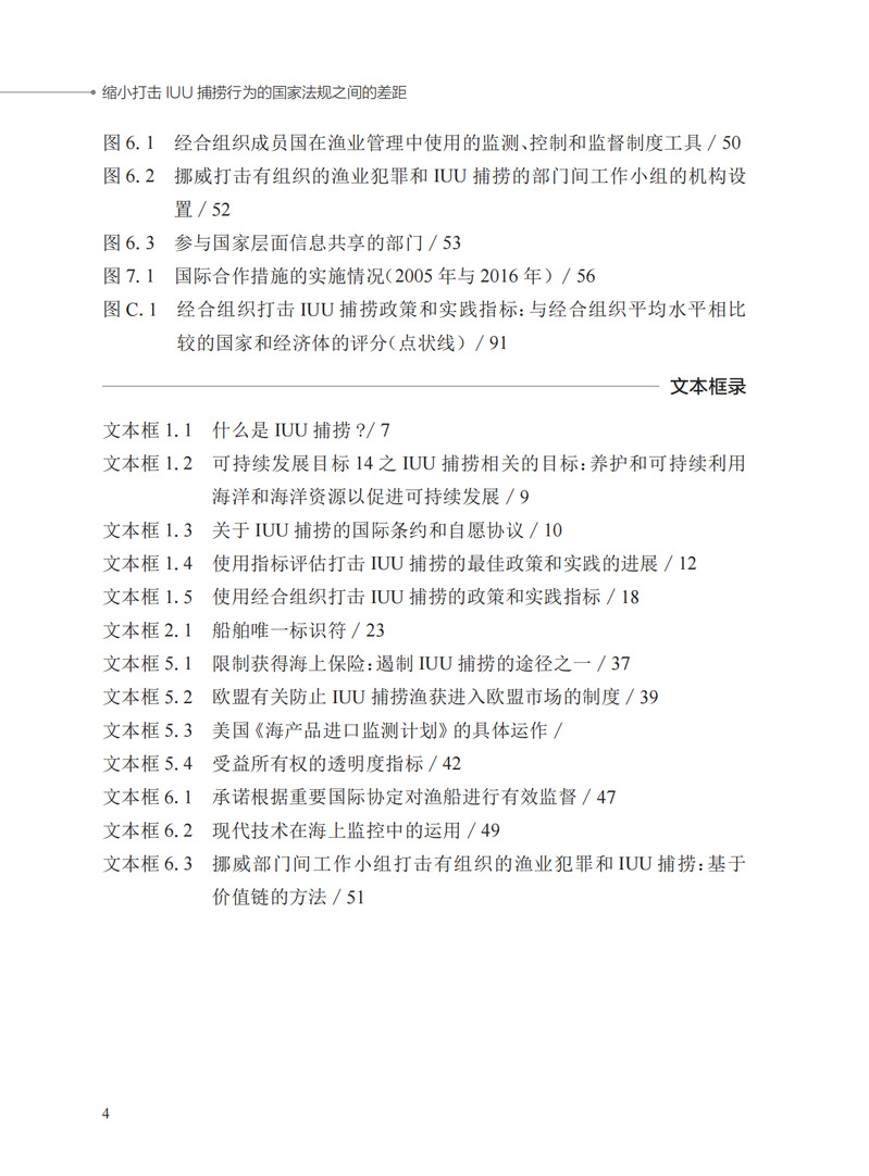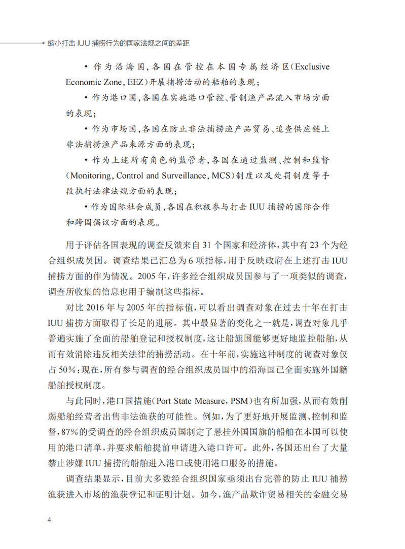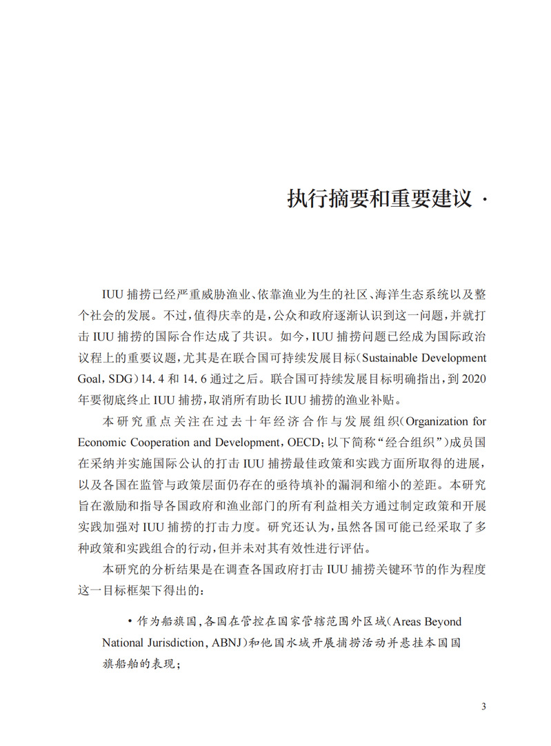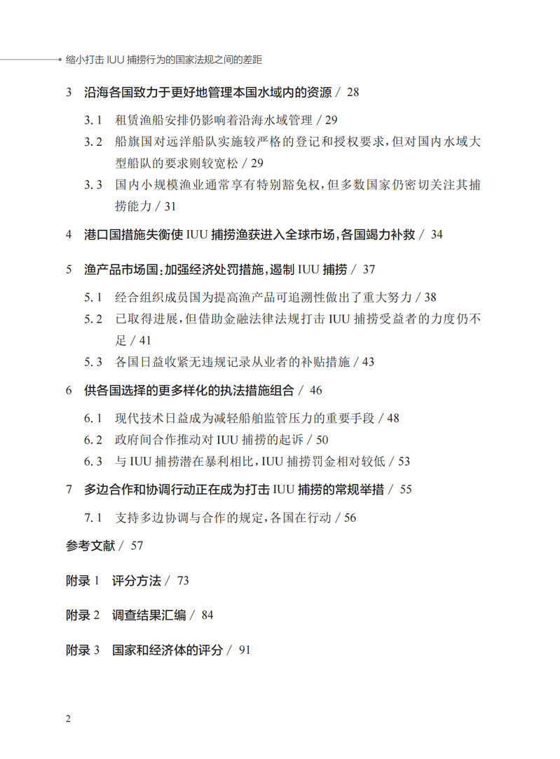 本书介绍了自2005年以来各国在打击非法、不报告和不管制(IUU)捕捞行为方面所获得的最佳政策和实践经验,旨在激励和指导各国政府、相关渔业部门和所有利益攸关方加强对IUU捕捞行为的打击力度。本书以政策指标为基础,梳理相关经合组织成员国在打击IUU捕捞行为方面所履行的职责。通过梳理发现,打击IUU捕捞行为的行动在过去十余年取得了显著进步。但是,根据国际法和各国国内法规,各国在单独和联合打击IUU捕捞行为方面所采取的措施之间存在差距,亟须弥合。
