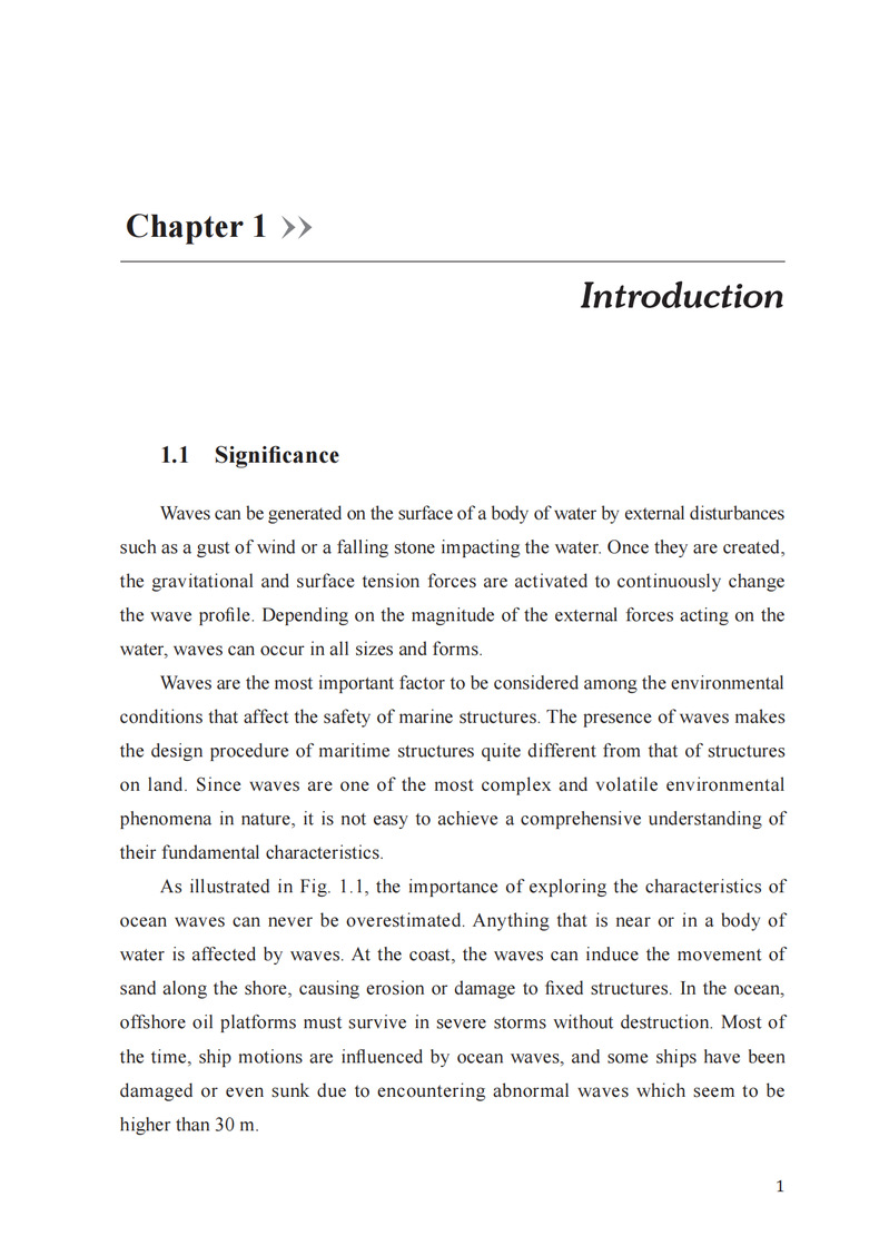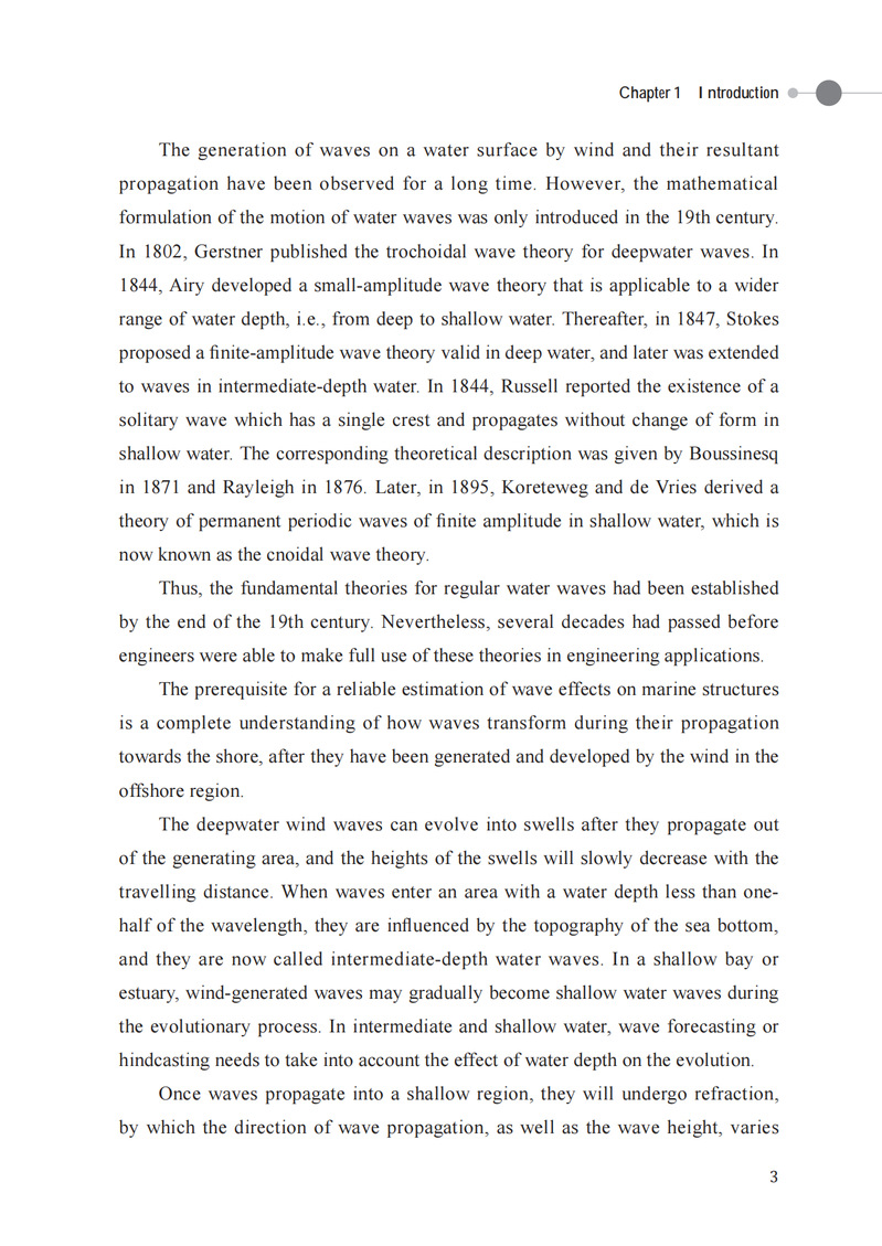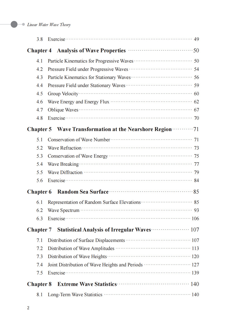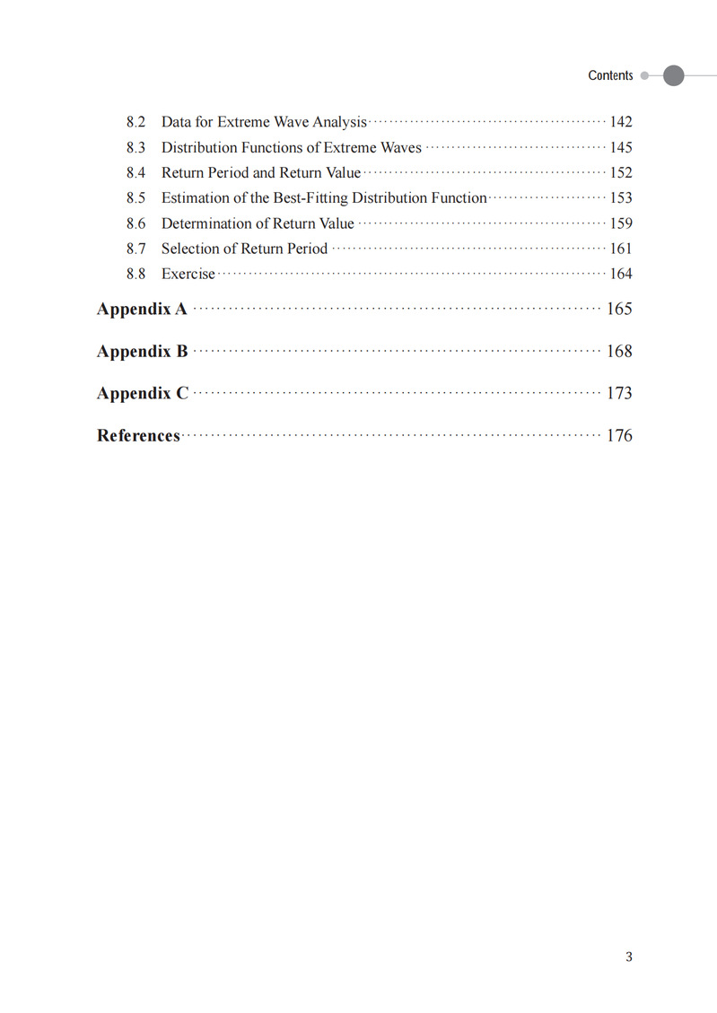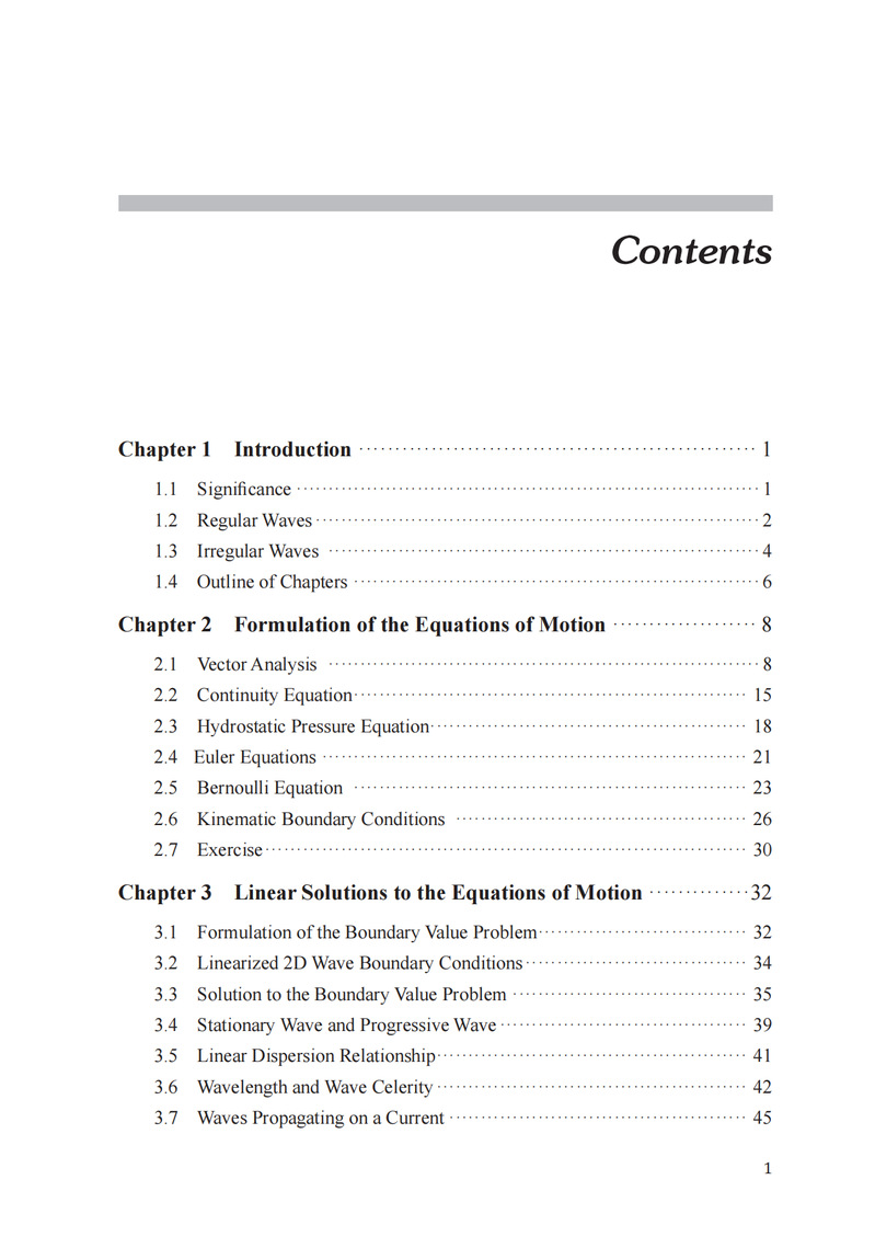 本书分为规则波和不规则波两大部分。第一部分首先描述了一些日常可见的水波现象,并用相关波浪理论进行解释;随后回顾势流理论和矢量分析,阐述线性水波理论并求出二维驻波和行进波的解析表达式;接下来讨论与工程相关的波浪特征,包括质点运动、压力场、波能、浅水效应、折射和衍射等。第二部分首先引入随机振幅和相位模型,并介绍两种获取波浪谱的方法,针对波谱类型进行说明后介绍谱矩在工程中的应用;随后推导出波面位移、波幅、波高和周期的概率预测模型,指出由于窄带线性假设的原因,模型预测与实测波浪数据会有偏差;最后讨论了长期波浪的分析,针对工程中在给定重现周期下求解极端波浪高度的一般流程进行详细说明和具体案例分析。