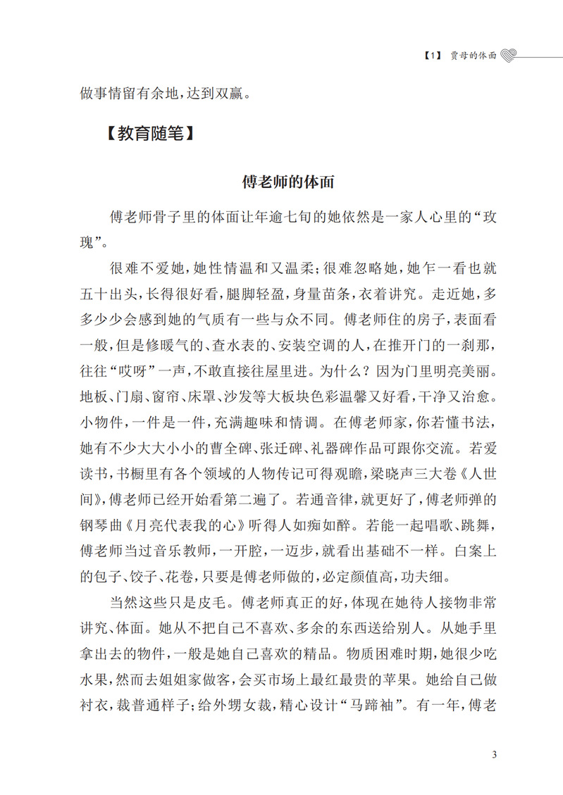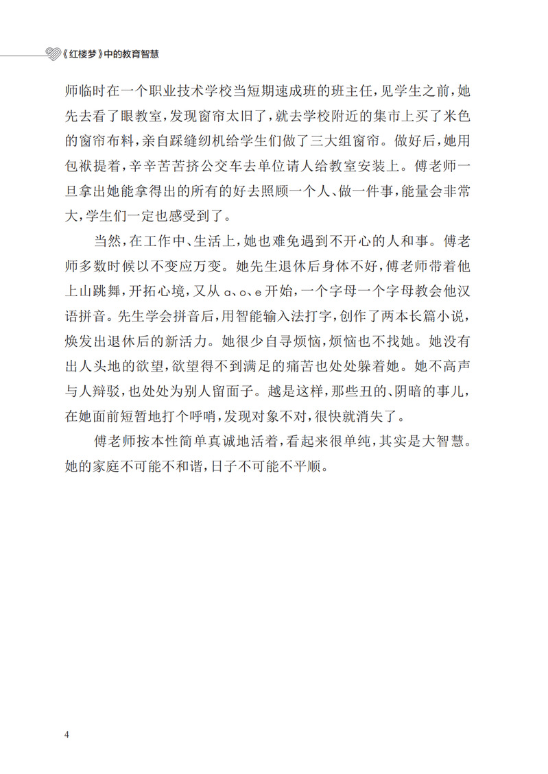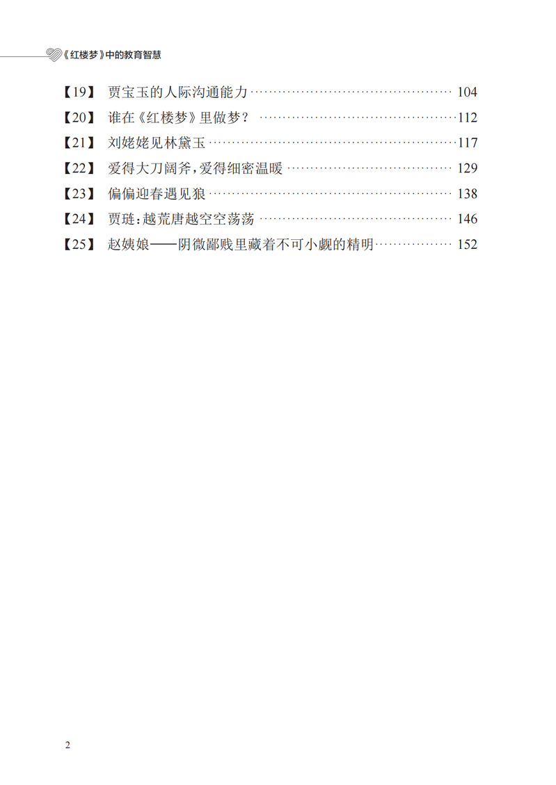 从教育的视角,特别是学校德育、家庭教育的视角重新解读《红楼梦》中的情节,挖掘教育的智慧。比如《贾母的体面》《薛宝钗的冷与暖》《贾宝玉的孝顺》《贾母的小精明与大糊涂》《林黛玉残缺的闺阁教育》《柳湘莲缺失的婚姻教育》《刘姥姥眼中的林黛玉》等。本书的创新性在于全国研究《红楼梦》的人很多,研究高中教育的人也很多,但是将两者结合起来的著作很少。此书从教育的角度解读《红楼梦》,可以立德树人,促进学生的全面发展,提升教师的育人专业素养。