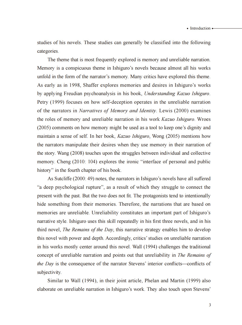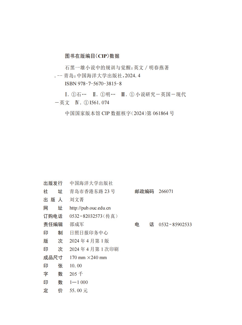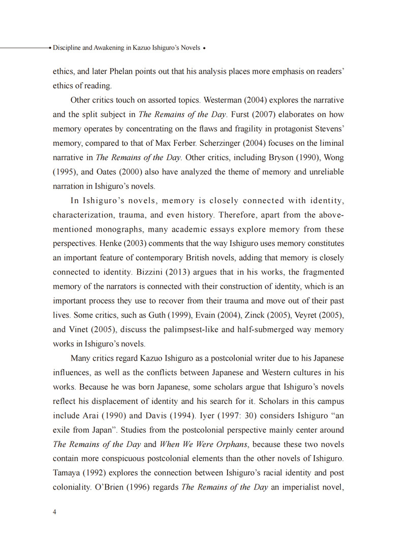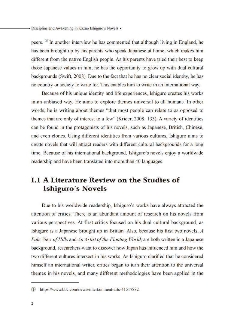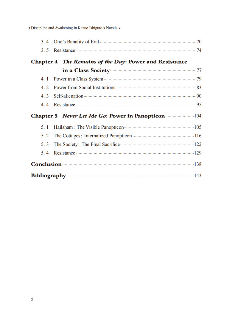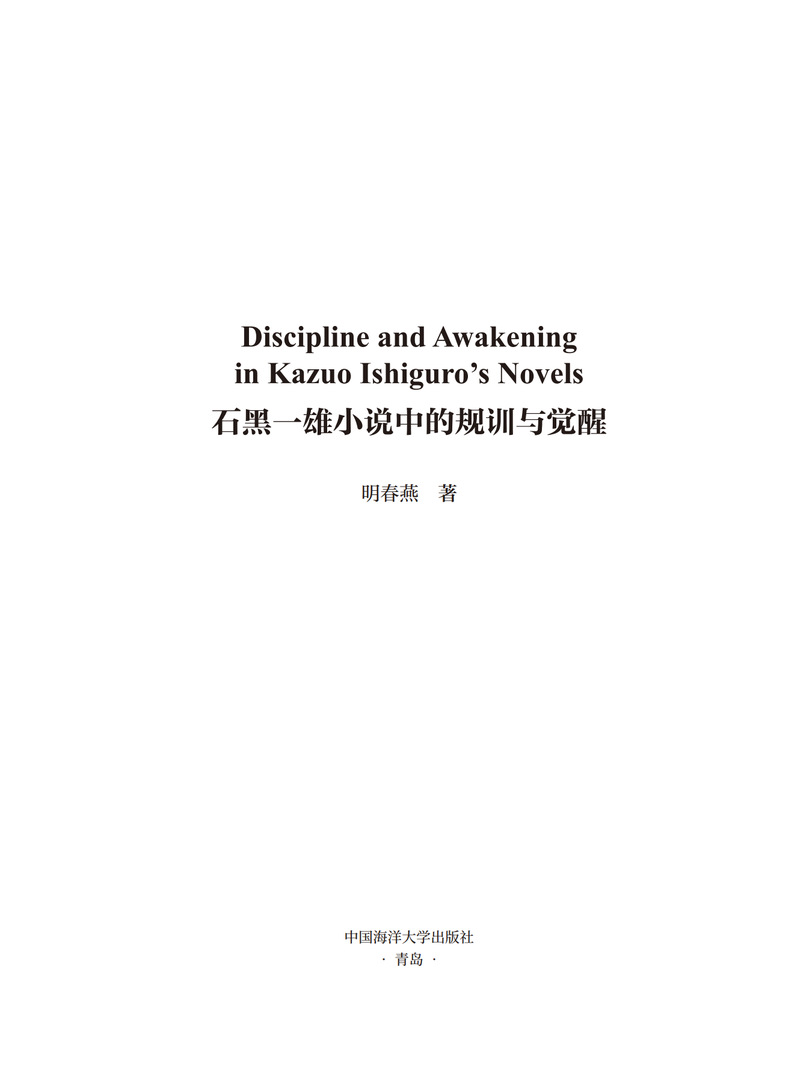本书主要探讨诺贝尔文学奖得主、英国小说家石黑一雄小说中的规训与觉醒这一话题,借助福柯的规训理论,选取石黑一雄的四部小说(《远山淡影》《浮世画家》《长日留痕》与《别让我离开》)作为文本分析的对象,探讨个体在宏观与微观层面受到的规训,以及个体在规训之下的觉醒。通过对每部作品的分析发现,石黑一雄在对规训的呈现模式上由隐性到显性,逐步深入;个体受到的规训直接导致了内心的创伤以及人生的虚无感;尽管规训无处不在,依然会有个体开始觉醒。个体的觉醒预示着作者对人性内在的力量充满信心。