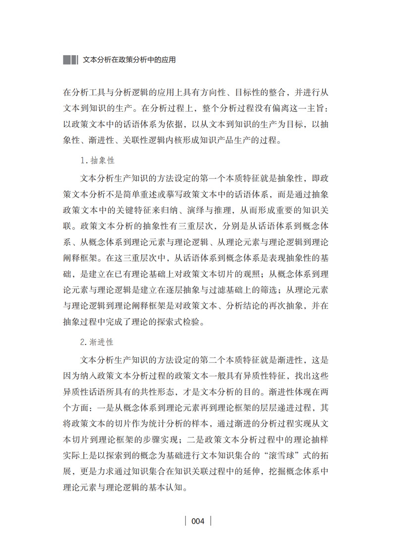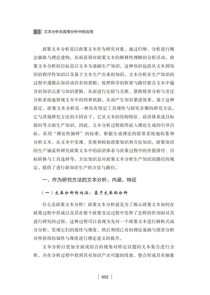 本书稿共分为七章,结构完整,逻辑清晰,将文本分析如何在政策分析中应用作为研究的中心议题,力图架起抽象理论研究与具体政策文本之间的桥梁。在理论价值方面,主要聚焦通过政策文本分析获得客观的、可重复的、可验证的政策工具、政策变迁的规律的研究方法与路径。在实际操作方面,着重从政策文本分析如何推进进行了目标设定、操作路径等的设计,并将所设计的政策文本分路径与方法在农民合作社政策变迁案例中进行了应用。有一定的学术研究价值和参考意义。