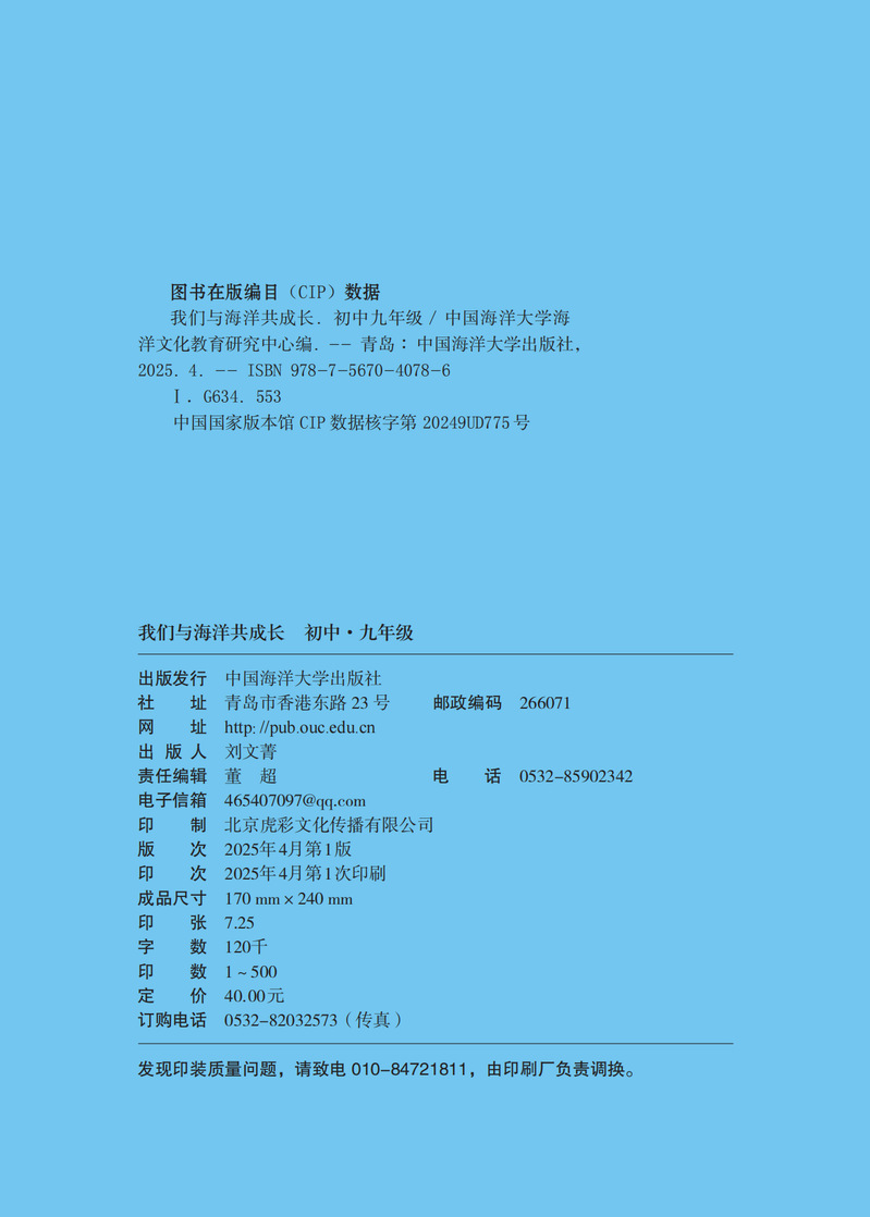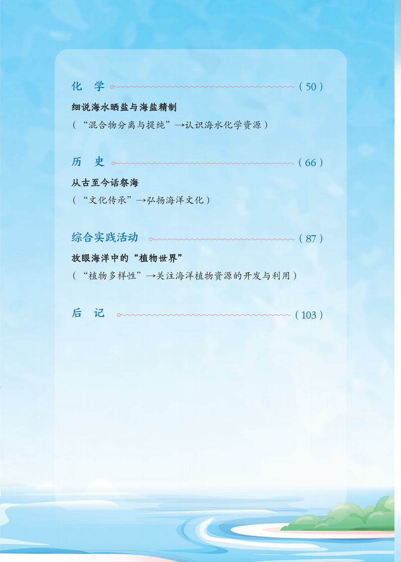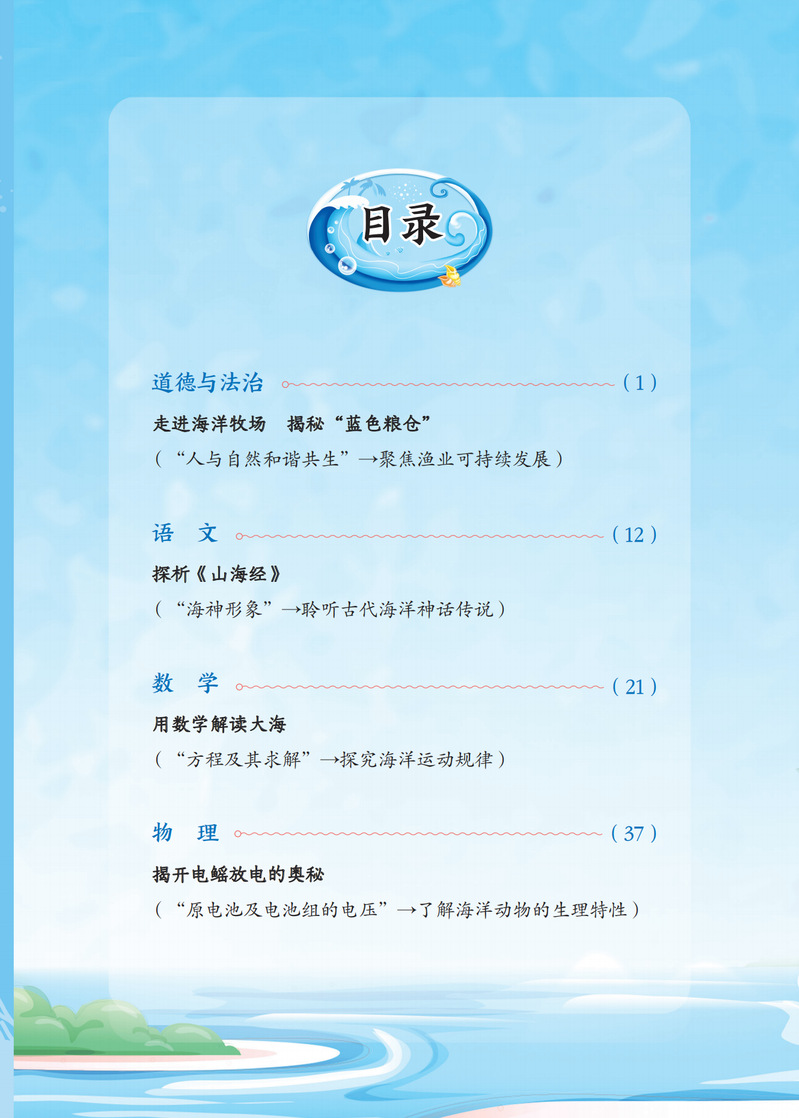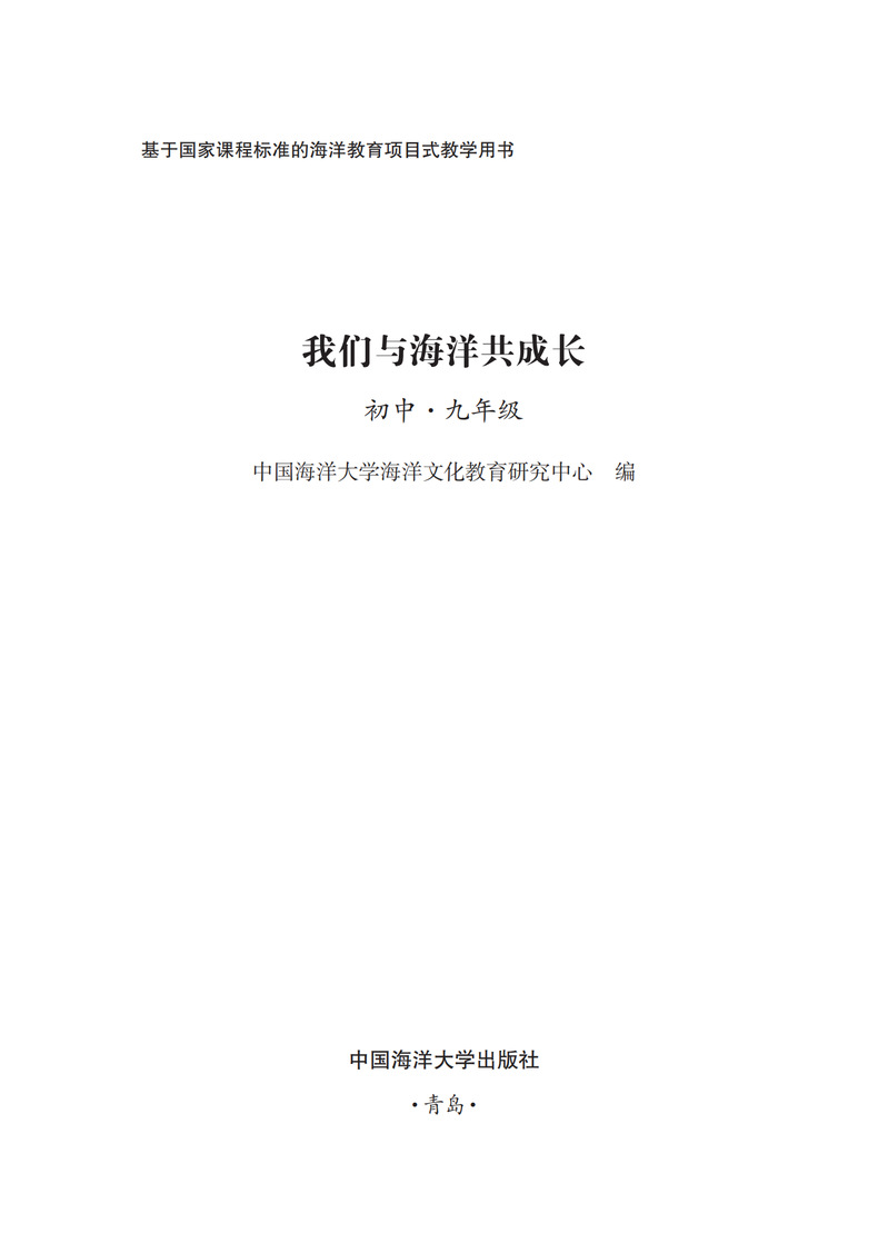 本书是基于国家课程教学的海洋教育项目式的探究活动,其具体内容与学科教学内容紧密结合起来,涉及国家课程的道德与法治、语文、数学、物理、 化学、生物学、历史、地理、综合实践活动学科,每个学科根据需要设置一个项目化学习活动,并在项目化学习活动标题下注明学科学习与海洋探究的融合点。 各学科的项目化学习活动均设置项目情境(包括“问题导引”)、项目活动两大板块,引导同学们开展各种探究活动,进行“身临其境的海洋学习”。本书可供初中九年级学生自主探究学习使用,亦可供初中九年级各科任课教师结合学科教学指导学生使用。