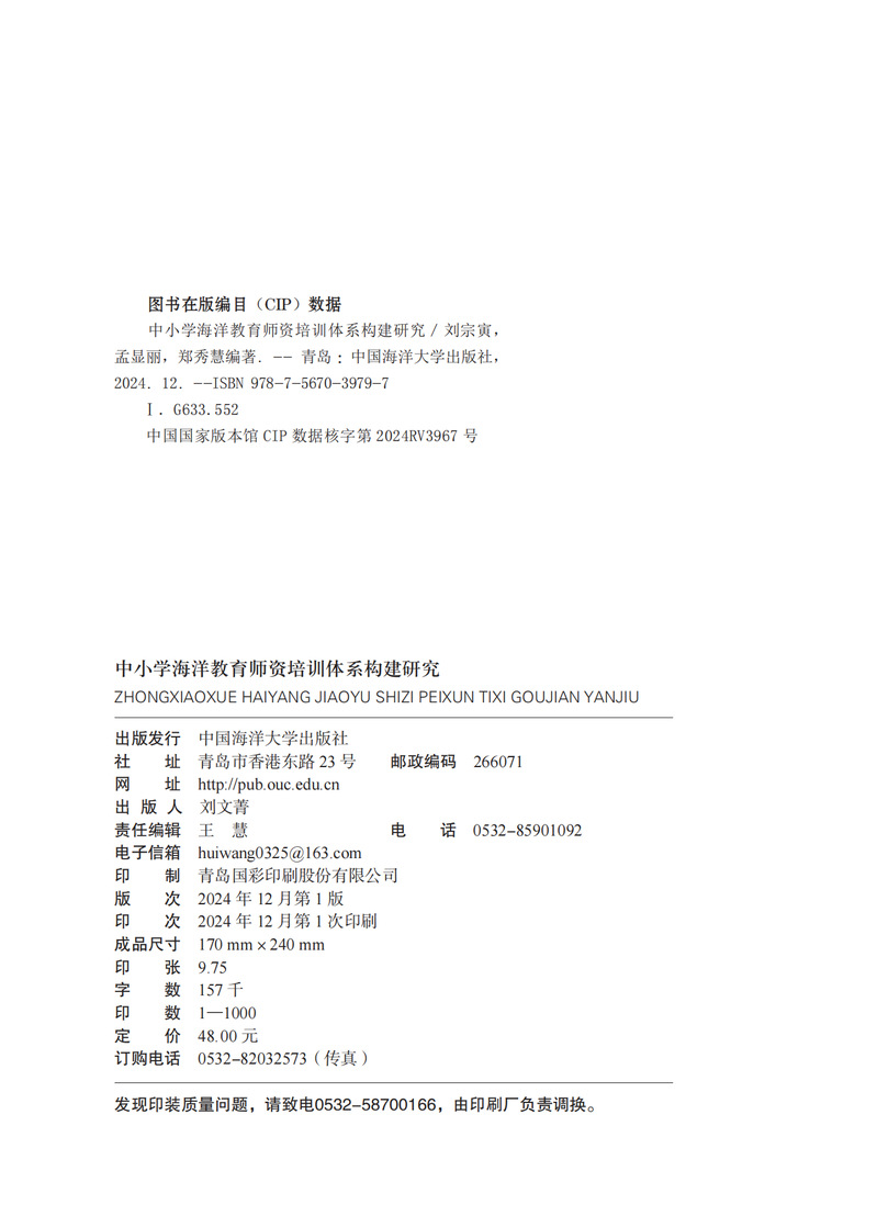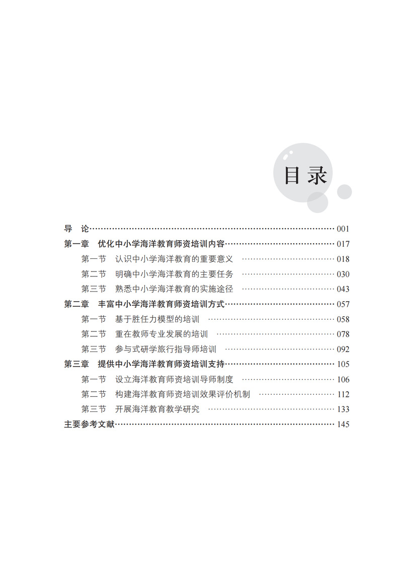 《中小学海洋教育师资培训体系构建研究》一书包括“导论”“优化中小学海洋教育师资培训内容”“丰富中小学海洋教育师资培训方式”“建立中小学海洋教育师资培训支持机制”“推进中小学海洋教育师资培训合作交流”这五部分内容,较为详细地探讨了海洋教育的意义与作用、海洋教育的任务和目标、中小学海洋教育的内容体系与实施途径,以及中小学海洋教育师资培训的重要性与紧迫性、中小学海洋教育师资培训的方式方法与支持机制,等等。