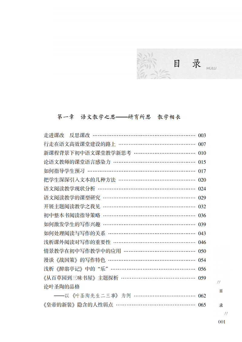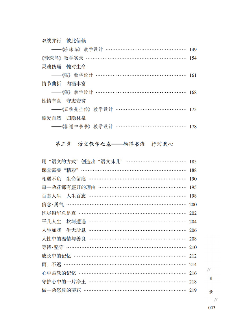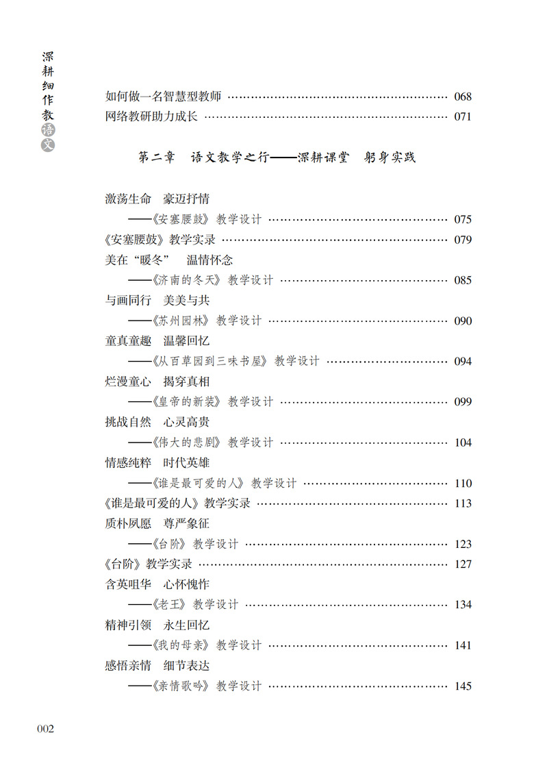 本书内容分为三章:第一章“研有所思,教学相长”主要是作者对语文教学的思考,针对语文课堂改革、阅读教学、写作教学和提高学生的语文学习兴趣、效率等提出自己的见解。第二章“深耕课堂,践行实效”是作者对语文课堂多年教学实践的案例设计,包括参赛获奖课例和教学实录,其中《济南的冬天》《亲情歌吟》荣获“全国中小学信息技术创新与实践活动”(教学实践评优赛项)一等奖;《珍珠鸟》《谁是最可爱的人》《伟大的悲剧》《老王》等都获市、区优质课一等奖。第三章“徜徉书海,抒写我心”是作者平时的阅读随笔,内容包括专业阅读书目、师生共同阅读的书目等。