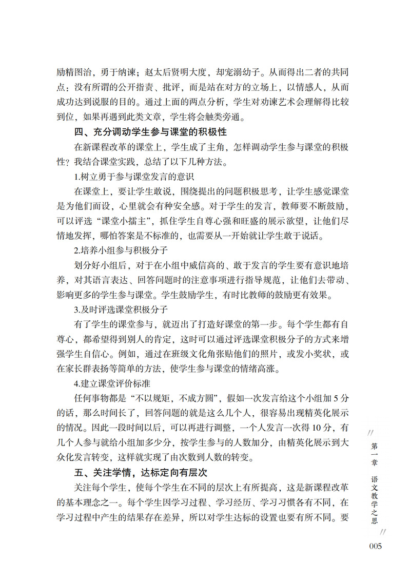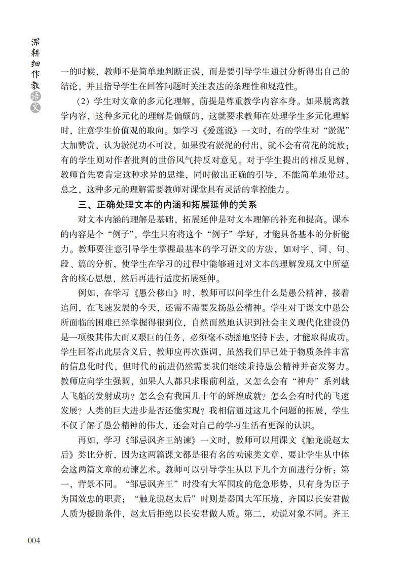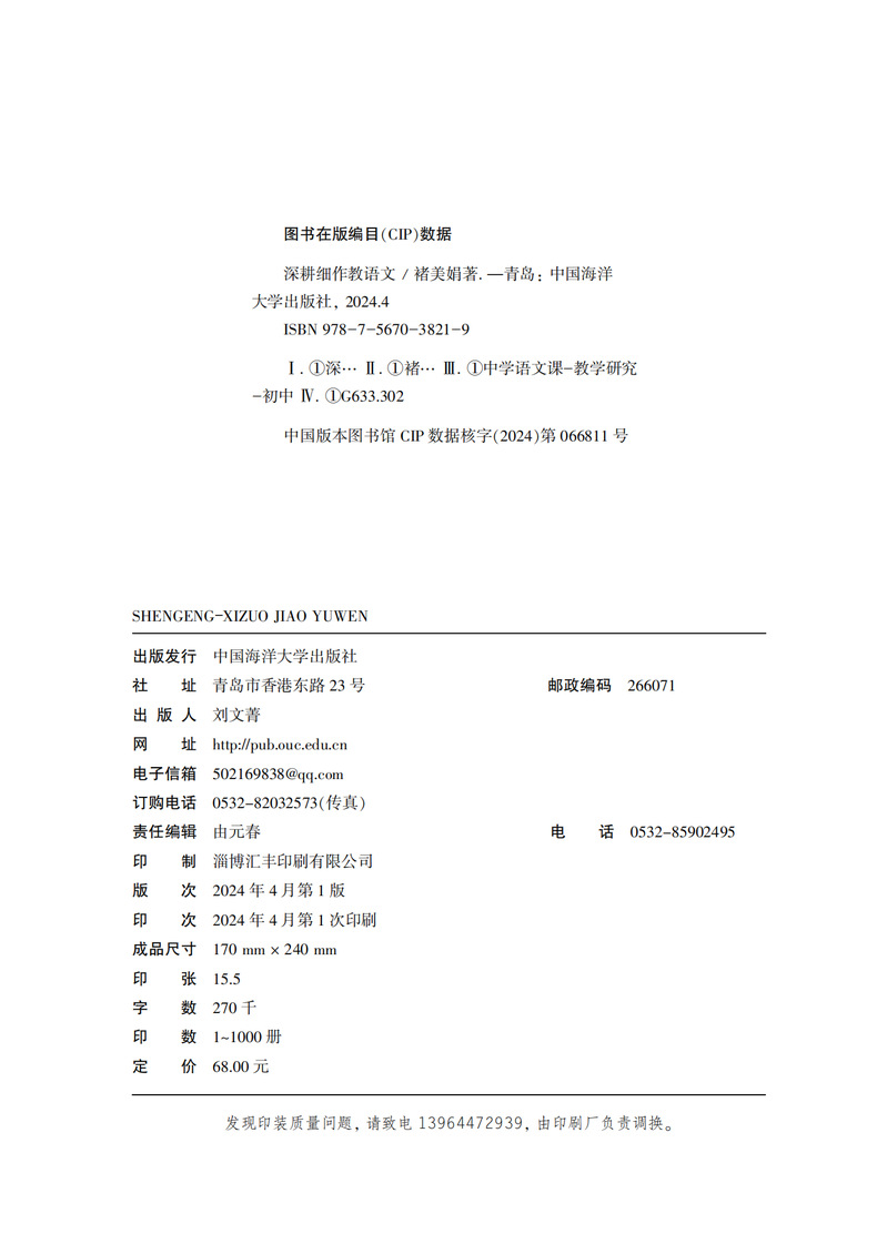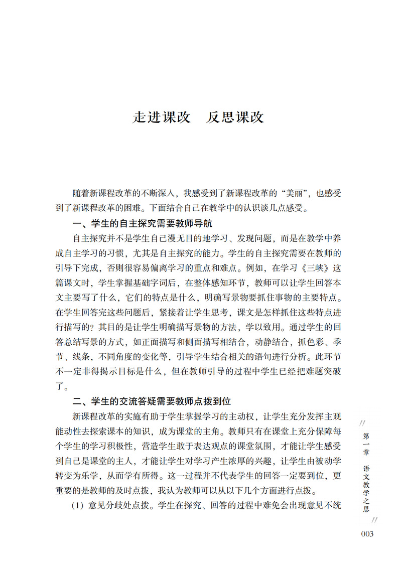 本书内容分为三章:第一章“研有所思,教学相长”主要是作者对语文教学的思考,针对语文课堂改革、阅读教学、写作教学和提高学生的语文学习兴趣、效率等提出自己的见解。第二章“深耕课堂,践行实效”是作者对语文课堂多年教学实践的案例设计,包括参赛获奖课例和教学实录,其中《济南的冬天》《亲情歌吟》荣获“全国中小学信息技术创新与实践活动”(教学实践评优赛项)一等奖;《珍珠鸟》《谁是最可爱的人》《伟大的悲剧》《老王》等都获市、区优质课一等奖。第三章“徜徉书海,抒写我心”是作者平时的阅读随笔,内容包括专业阅读书目、师生共同阅读的书目等。
