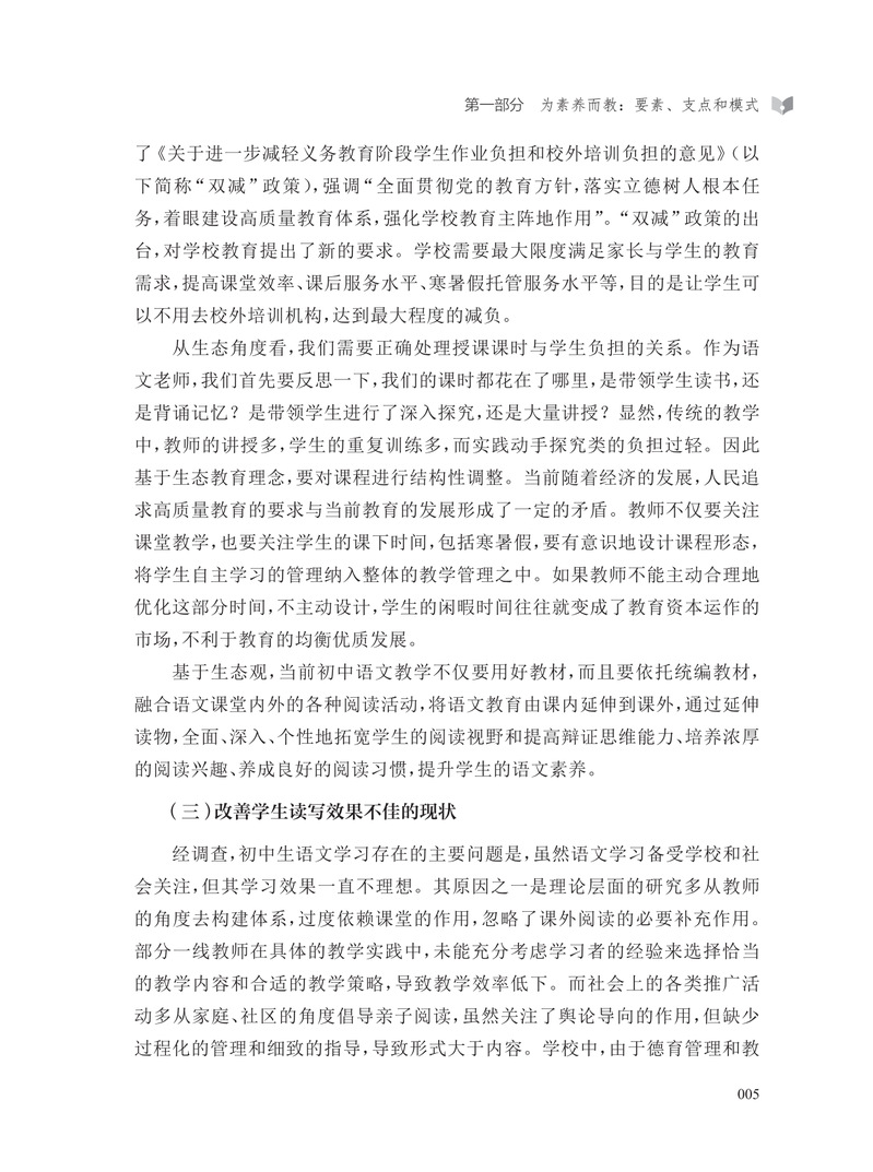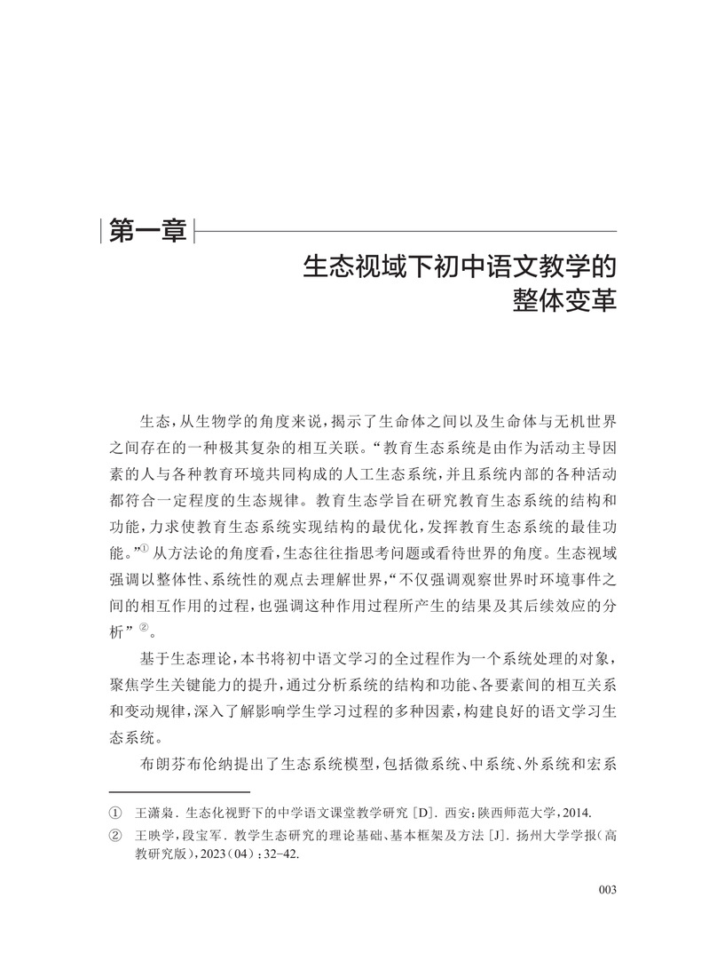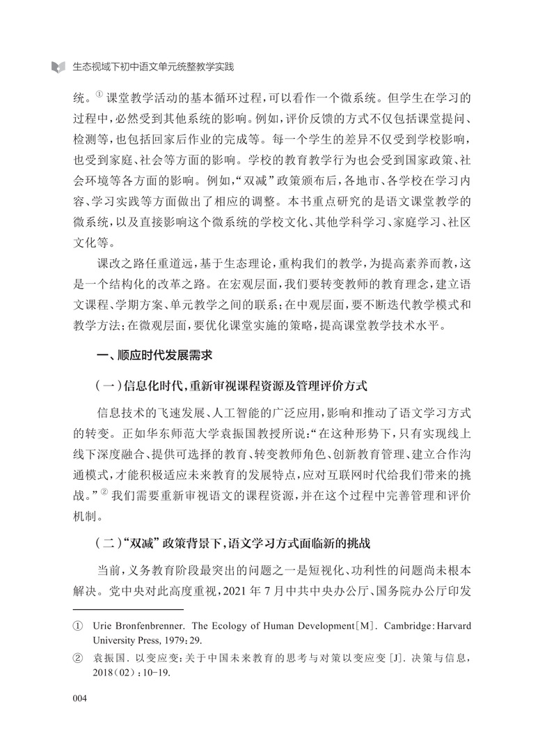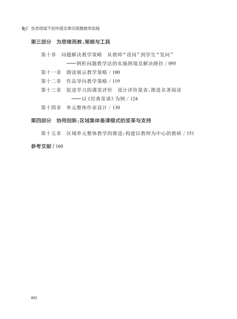素养立意下的初中语文教学需要聚焦学生学科思维发展,从单篇走向单元,从教的视角转向学的视角。本书基于“生态”理论,采用系统化视角,分析了初中语文单元统整教学的实践方法。宏观层面探索单元教学设计的基本要素、单元活动设计的支点及实施的基本模式,实现教学评一致,建立语文课程与单元教学的有机联系。中观层面总结不同类型单元设计的一般方案,以及整本书阅读、写作教学变革、跨学科统整教学的实践经验。微观层面形成基于成果导向的系列教学策略及应用技术。本书为变革教与学的方式,实现知识统整、问题解决、价值关切三位一体式的单元任务式推进,做出了积极的探索。