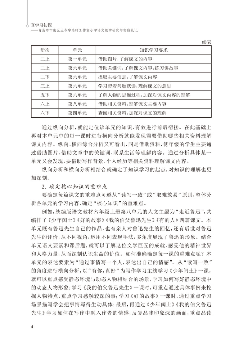 本书是王冬宇老师做区域语文教研工作的工作札记,也是工作室老师们在新课标颁布后,精心整理,不断反思的研究历程,更是市南区骨干教师们实践新课标的阶段成果。我们在探索语文课堂教学真实高效的过程中,逐渐凝练出了“核心知识序”“认知建构序”“学习活动序”的“三序合一”的教学法。书中,对“三序合一”进行内涵进行界定,阐述相关理论依据。在此基础上,研究出了有一定实践意义的操作流程和实施路径,用单元教学案例的方式,呈现了“三序合一”课堂在师生真实互动,实现学生核心素养的发展的过程,希望对一线教师有一定的借鉴意义。