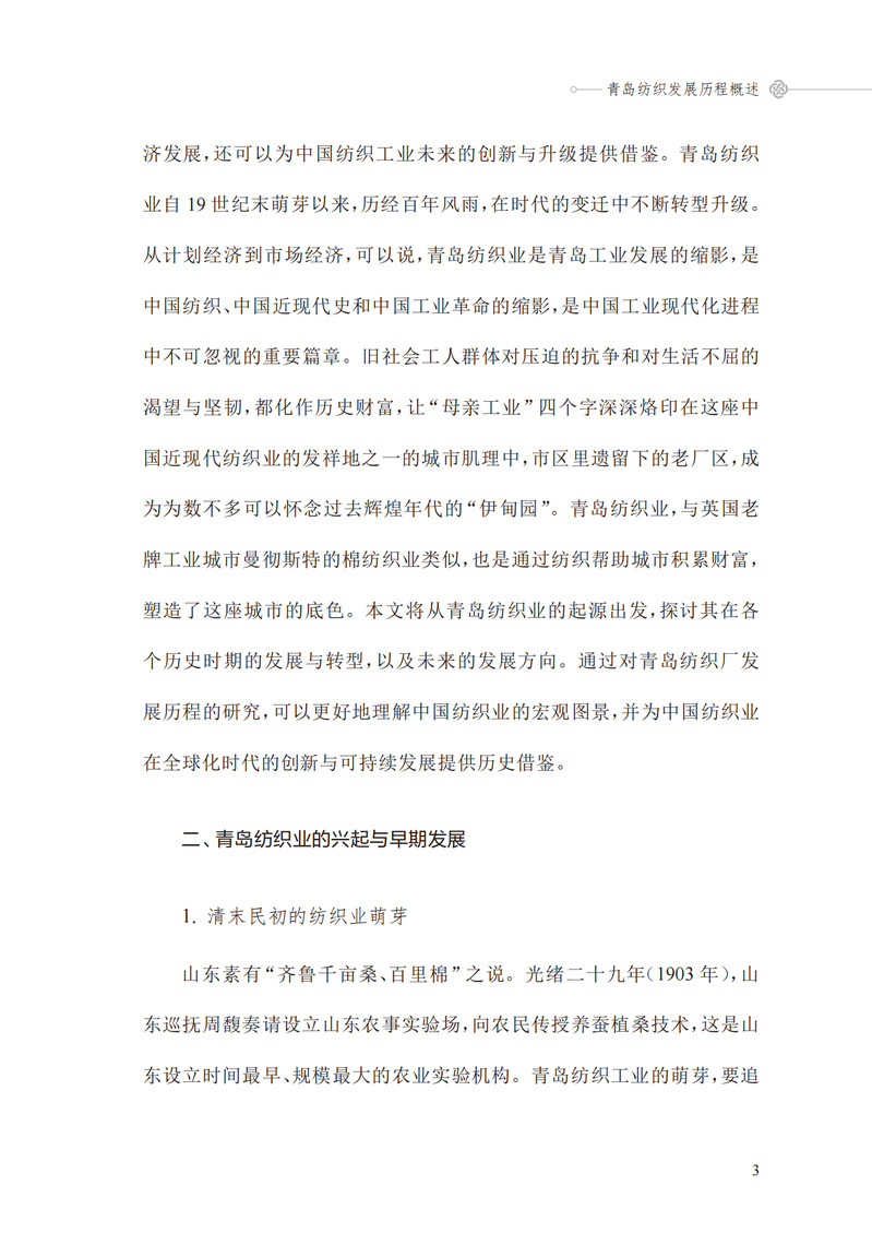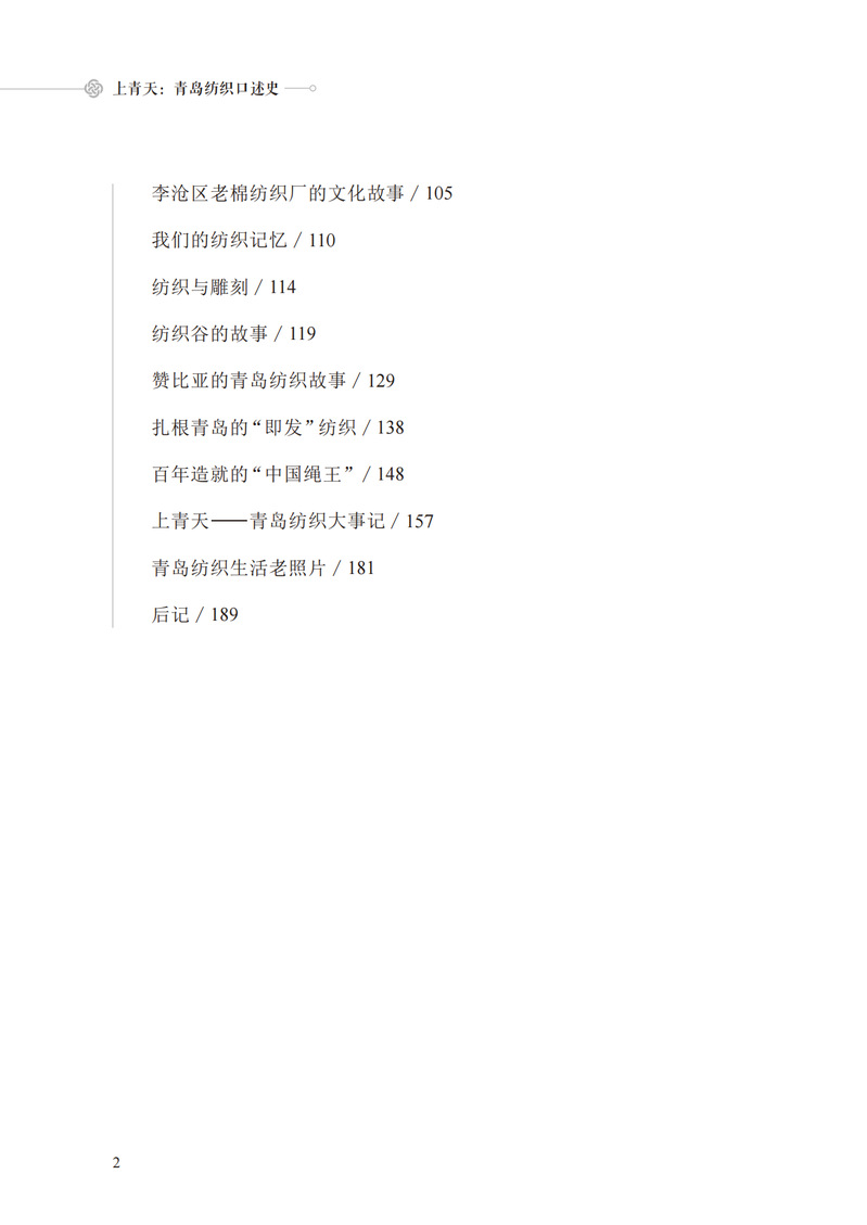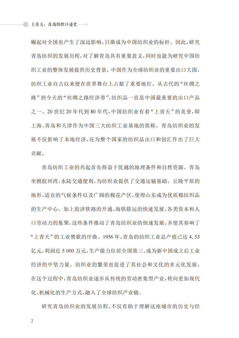 中国作为世界上最早开始纺织的国家之一,有着悠久而又深刻的纺织历史。本书聚焦新中国成立后的纺织业发展。首先通过“上青天”的由来,介绍中国近代纺织最有代表的三座城市,继而引出本书主题——青岛近现代纺织历史。通过不同经历者的口述,横向描绘了青岛纺织业近现代对中国纺织发展的贡献,纵向深入具体的青岛纺织工人,刻画了当时的艰苦奋斗、勇于拼搏的精神的画卷。配合丰富的图片资料与扫描二维码即可播放的采访片段,为读者提供“看”“听”双重历史体验。重温过去最真实的情况,并为以后的纺织发展提供历史文化参考价值。