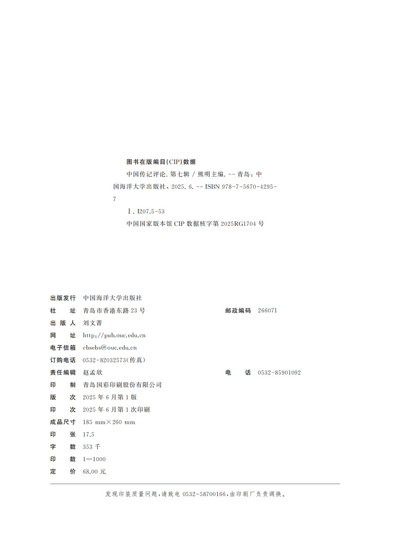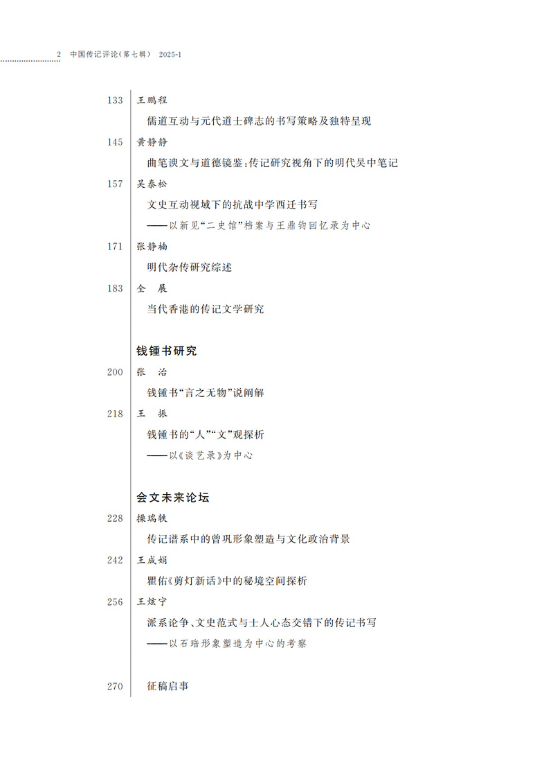 《中国传记评论》是由国家社科基金重大项目首席专家熊明教授主编、开云电竞网址传记与小说重点研究团队负责编辑出版的学术辑刊。每年出版两辑。《中国传记评论第7辑》包括以下六大主题板块:第一板块为特稿,第二板块为中国古代杂传整理与研究专题,刊发国家社科基金重大项目“中国古代杂传叙录、整理与研究”的最新成果,共3篇。第三板块为古今中外传记综论,刊发国内外学者投稿,9篇,内容涉及中外古今传记研究。第四板块为钱锺书研究,共2篇。第五板块为会文未来论坛,共3篇,刊载优秀青年学者传记研究论文。