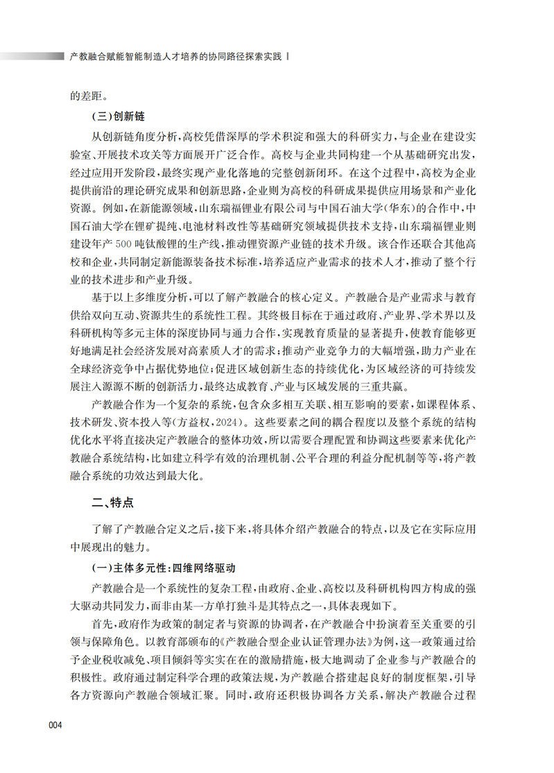 本书系统研究产教融合如何助力智能制造人才培养,分三篇12章。理论篇解析全球制造业智能化转型趋势,阐述中国制造2025战略下的人才需求矛盾,梳理国家产教融合政策体系。实践篇聚焦校企协同育人模式,通过共建产业学院等案例,探讨课程优化、实践能力提升及科技成果转化的有效路径。展望篇提出产教融合未来发展方向,构建长效协同机制。全书以破解“教育供给与产业需求错位”为核心,突出校企资源整合、实践教学创新、产学研用联动三大重点,为高校管理者优化专业设置、企业完善人才培训、政府部门制定政策提供实践参考,兼具学术价值与应用价值。适合教育研究者、装备制造企业及产教融合政策制定者阅读。