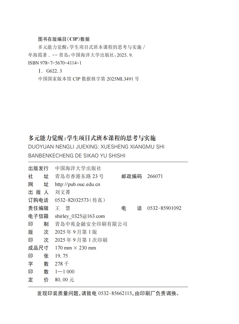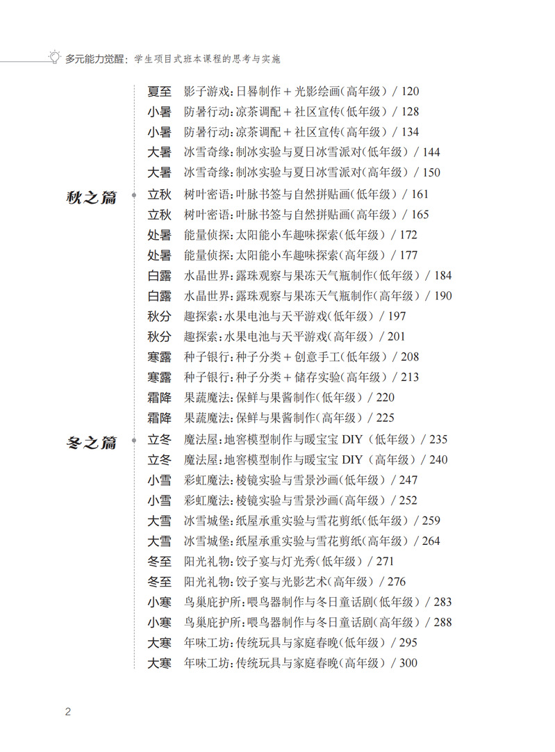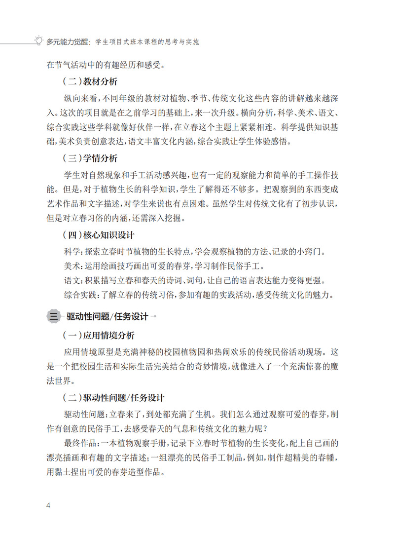 本书是深入探讨以项目式班本课程促进学生多元能力发展的教育实践指南。本书以二十四节气为脉络,为读者呈现了丰富多样、生动有趣的学生项目案例。每个节气都巧妙融入了独具特色的内容,项目涵盖艺术、科学、文化、体育、环保、社会实践等多个领域,旨在全面激发学生的观察能力、动手能力、思维能力、沟通协作能力、文化传承能力等多元能力。通过对每个项目的课程思考、实施过程、成果展示和反思总结等方面的详细阐述,为教育工作者提供了极具参考价值的课程设计思路和实践方法,助力教师打造充满活力和教育意义的班本课程,促进学生在节气的轮回交替中实现多元能力的觉醒和全面发展。