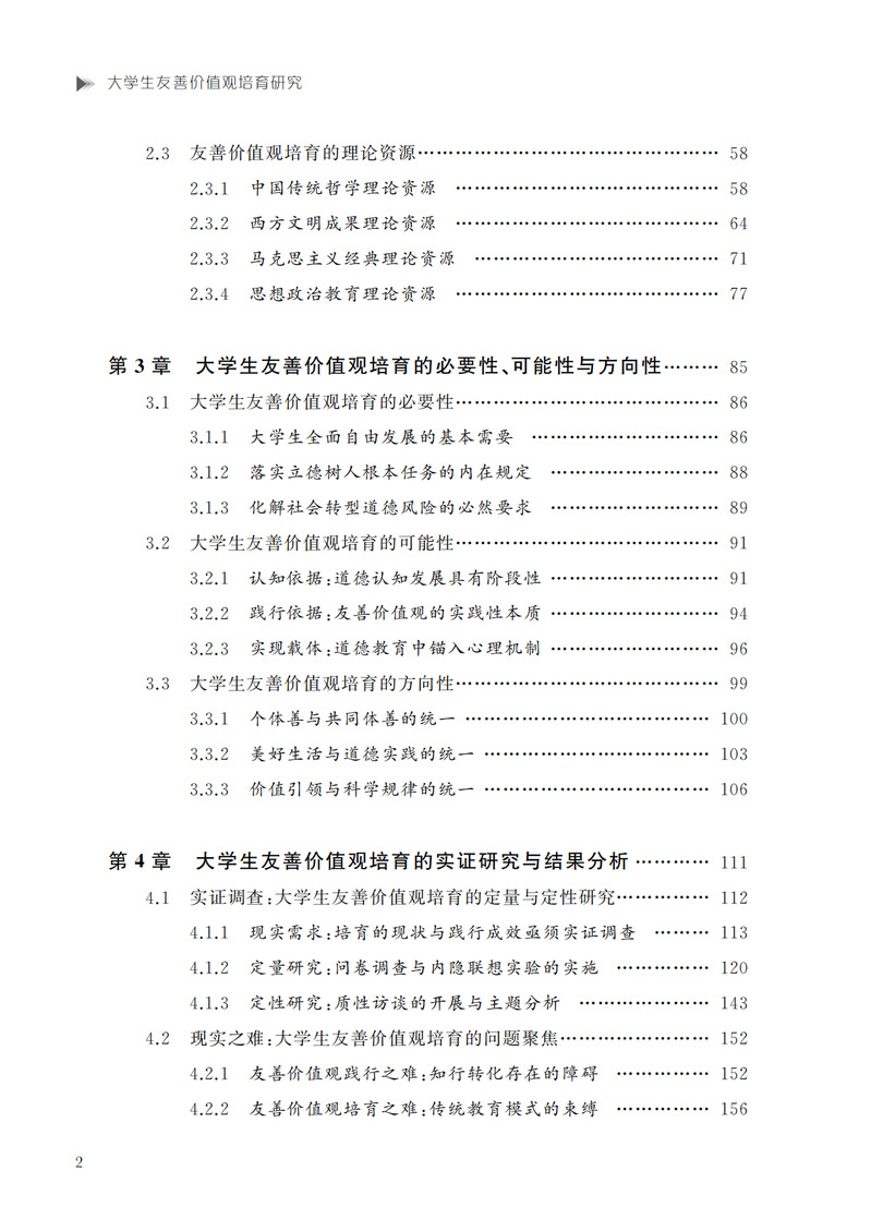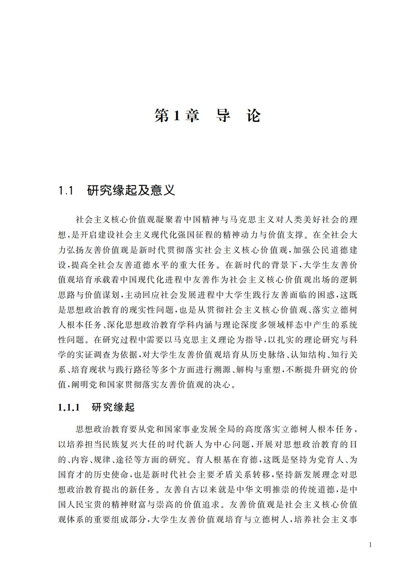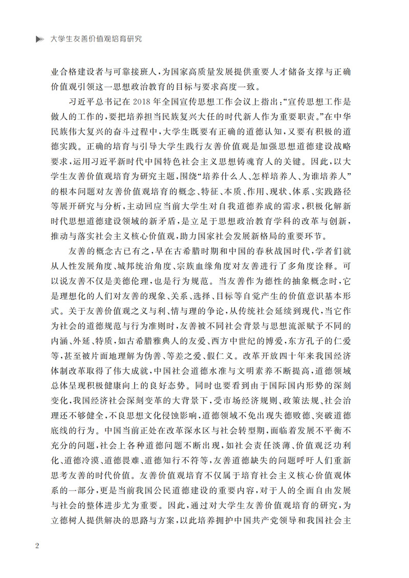 友善价值观是社会主义核心价值观的重要内容之一,也是社会主义核心价值观整体的有机组成部分。本书以大学生友善价值观培育作为研究对象,充分探讨大学生友善价值观的现状、知行特点、培育路径等内容,对培养大学生在道德认知和实践活动中关心自身、关心社会、与整个世界友善相处,从社会主义核心价值观的方面为大学生营造全面自由发展外在的友善交互环境和内在的友善价值培育环境,将友善夯实在大学生的认知与践行中,是当前思想政治教育刻不容缓的职责所在与使命担当,也是破解当前大学生友善践履能力提升之难的需要。
