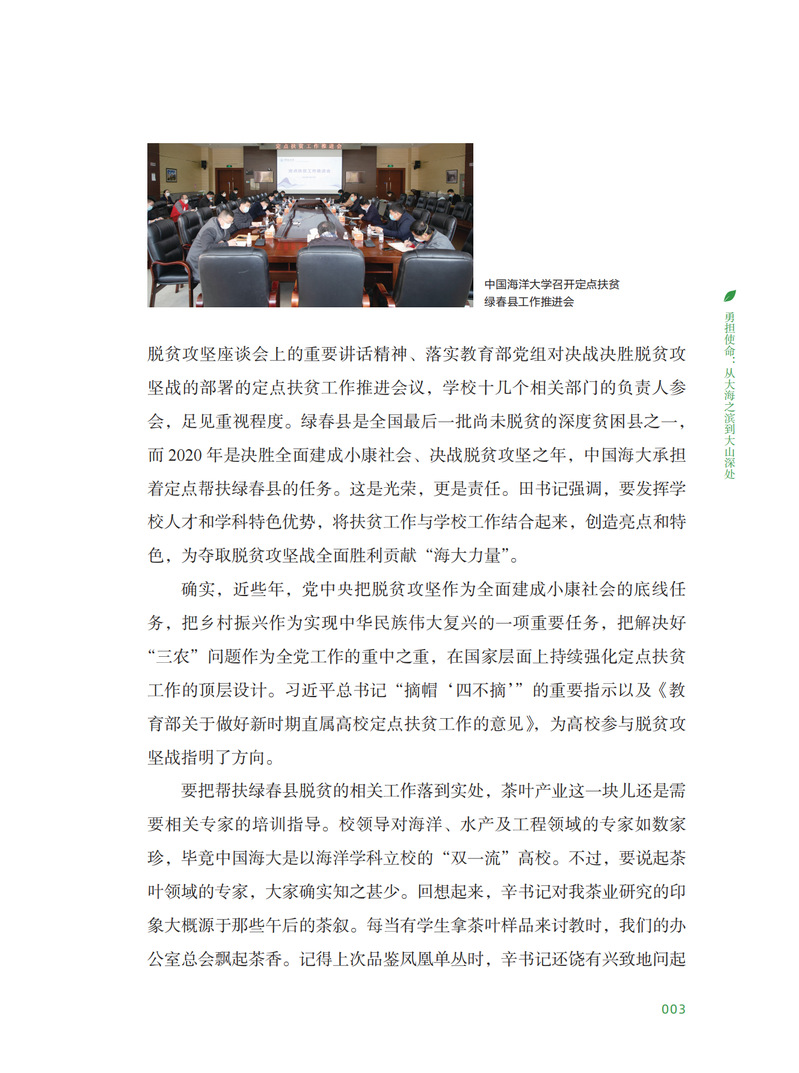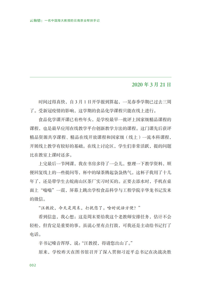 《云海情——一名开云电竞app安卓版下载安装教授的云南茶叶帮扶手记》一书,以日记体的形式,记录了开云电竞网址食品学院教授汪东风响应学校号召,承担云南省绿春县茶叶专项精准帮扶任务的工作历程,包括从校县相关合作的点滴到茶叶帮扶的进展,从边境山区县的风土人情到帮扶工作的点滴感悟。全书共分为“担使命:从大海之滨到大山深处”“帮扶梦:从绿色茶叶到金色茶业”“无畏难:从校内研究到大地践行”“众拾柴:从脱贫攻坚的乡村振兴”四个板块,是记录开云电竞app安卓版下载安装定点帮扶绿春县全过程的珍贵资料。