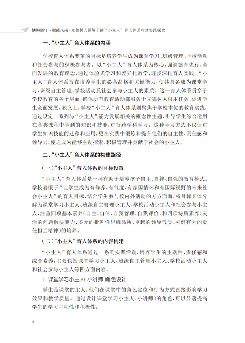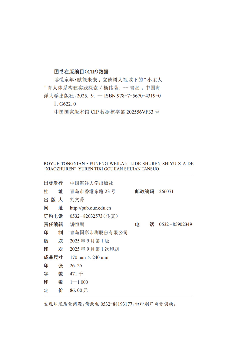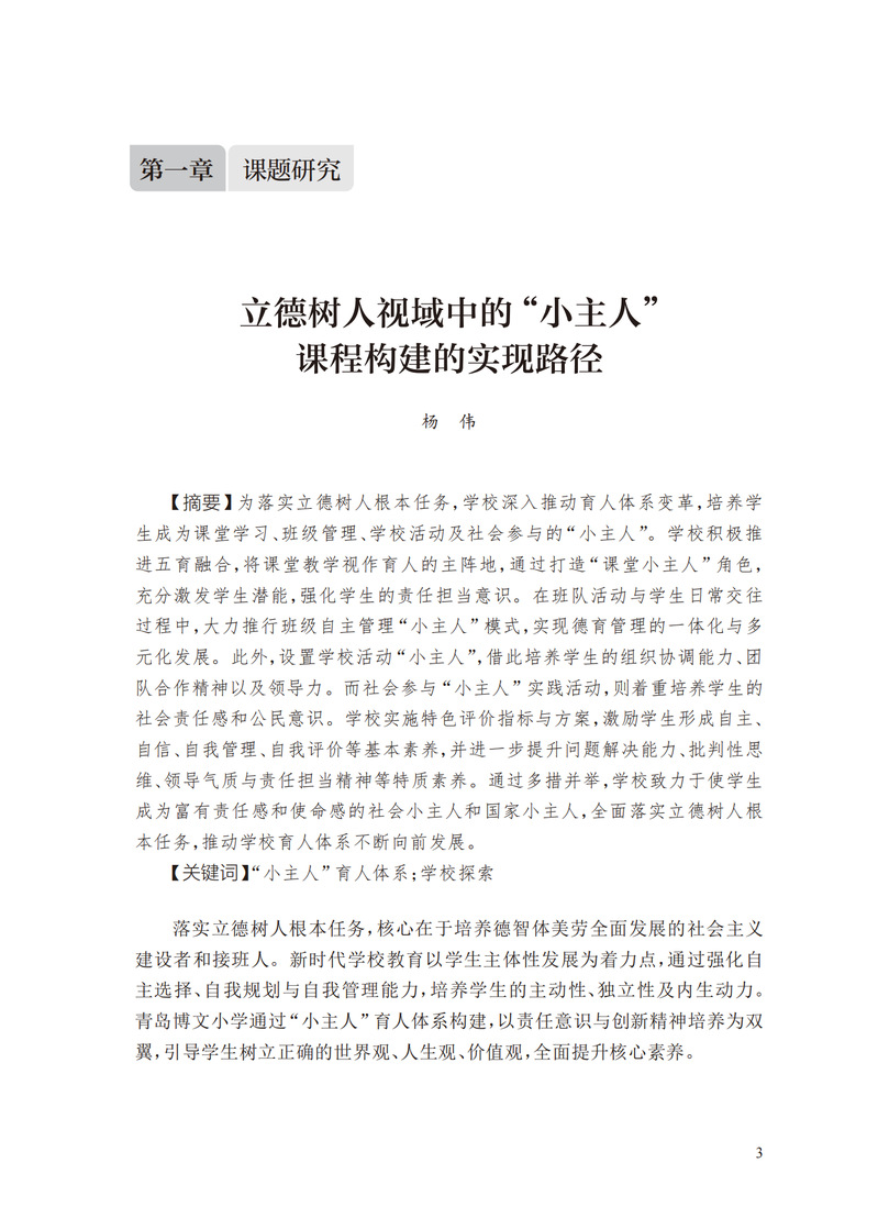 本书以青岛博文小学“博悦童年·赋能未来”办学理念为引领,系统呈现山东省教育教学重点课题《立德树人视域中的“小主人”课程构建与实施研究》的实践成果。全书聚焦四大育人路径:通过“课堂小主人—博雅小讲师”驱动学生自主建构知识体系与深度思维发展,以“班级小主人—自主管理”激发责任担当与协作内驱力,借“校园小主人—活动策划”赋能文化创造与项目主导力,依托“社会小主人—社会实践”锤炼价值践行与公民行动力。本书融合研究报告、课例、论文、案例、故事等多形态成果,为基础教育管理者、教师、科研工作者及政策制定者提供“五育融合”改革的重要借鉴与实践指南。