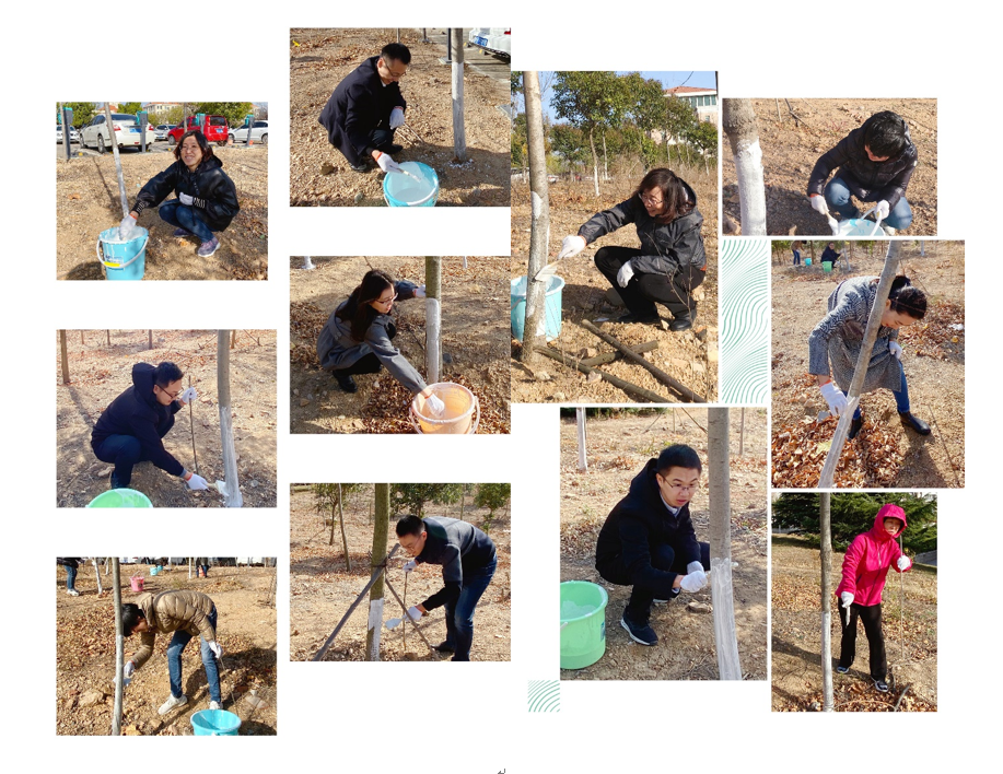 为达到树木涂白美观一致,起到良好的防病虫害效果,支部党员同志们在专业人员现场指导下将事先按照严格比例配置的涂白石灰均匀地涂刷在树干上。虽然大部分党员同志是第一次从事本项工作,但都非常认真,高标准、严要求,均匀严密地进行涂刷,并对树木缝隙、洞孔等处反复涂刷。即使石灰水溅到身上,也没有影响劳动热情,经过一个多小时的忙碌,行远楼西侧小树林的树木穿上了“新装”。