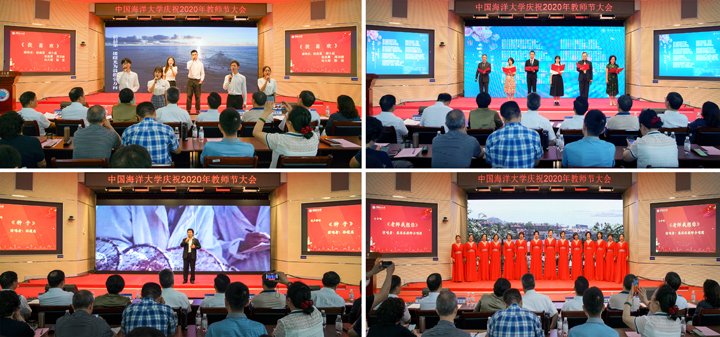 会上,大学生艺术团的学生们倾情演唱《我喜欢》,表达了对老师们的敬爱之情;去年加盟海大的名师工程讲座教授于慈江老师专为今年教师节创作了诗歌《我的大学,我的校园》,并与5位师生共同朗诵;基础教学中心孙道东老师的美声独唱《种子》和离退休合唱团的《老师我想你》唱出了浓浓感恩情。
