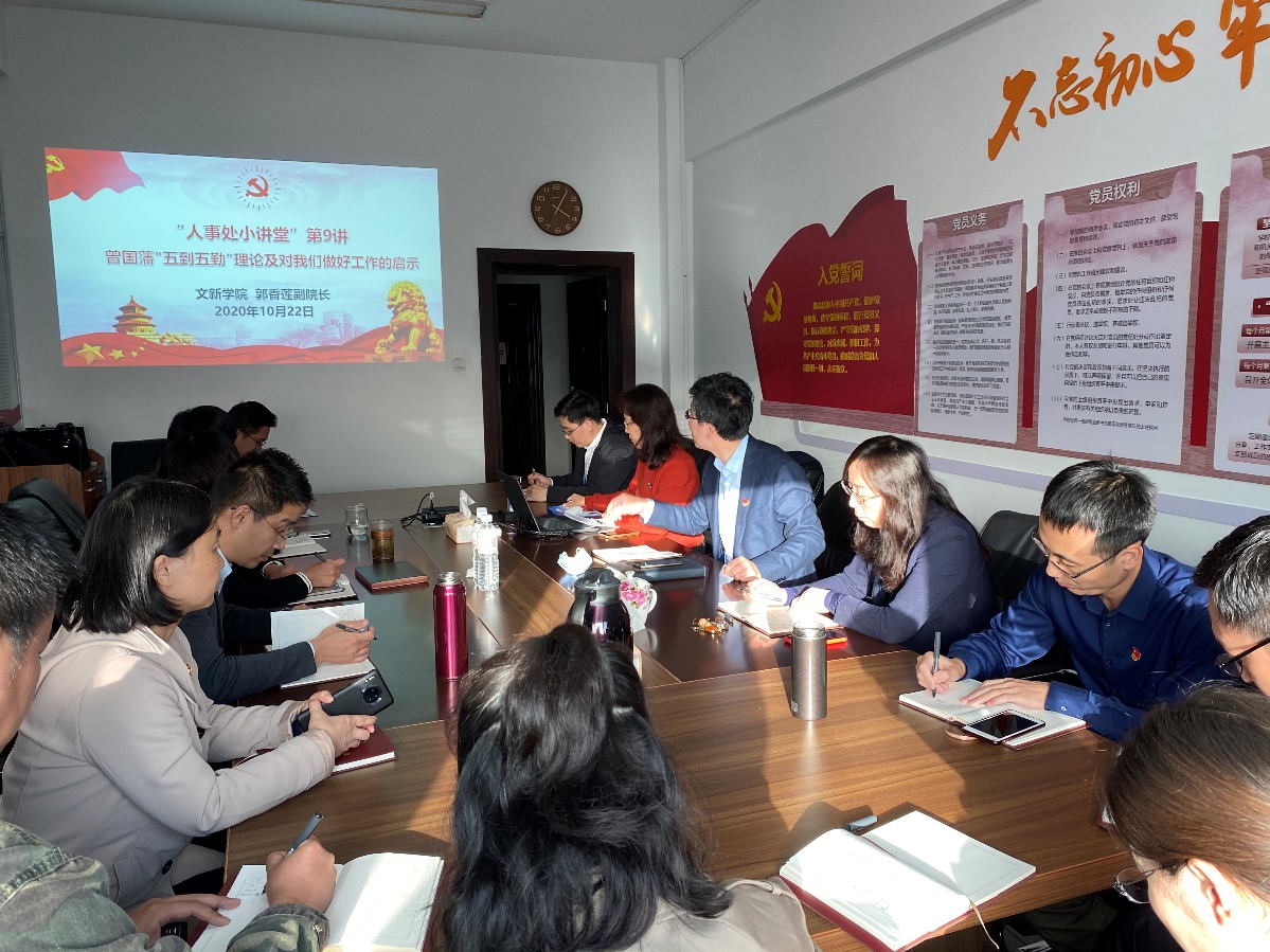 为进一步加强“人事处小讲堂”党建活动品牌和“样板党支部”建设,推进党支部学习理论学习与实际工作相结合,10月22日下午,党委教师工作部、人事处党支部开展“人事处小讲堂”系列活动第9讲,邀请文学与新闻传播学院郭香莲副院长以“谈曾国藩‘五到五勤’理论及对我们做好工作的启示”为题作专题报告。党支部书记范其伟主持报告会。