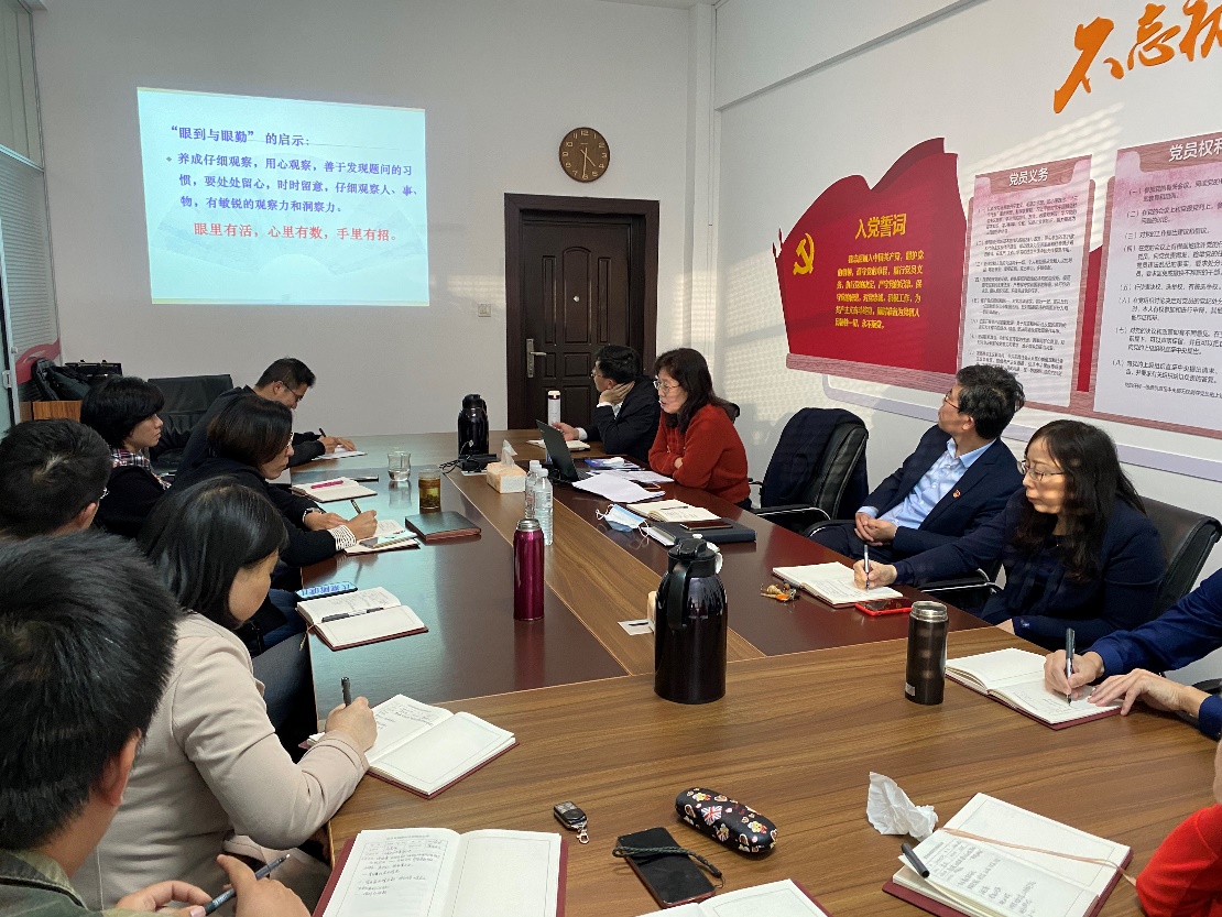 郭香莲从曾国藩的基本情况讲起,指出曾国藩虽然出身贫寒且天赋平平,却得到了后世“立功立德立言三不朽,为师为将为相一完人”的评价,这与他非常重视“勤”是分不开的。随后,郭香莲详细介绍了曾国藩“五到五勤”理论,即“眼到、心到、身到、手到、口到,眼勤、心勤、身勤、手勤、口勤”,指出“五到五勤”既是曾国藩的培养人才、为人做事和为官为政之道,也是一种良好的思维习惯和行为习惯。她结合“五到五勤”理论,分享了“眼里有活,心里有数,手里有招”“学思结合”“以身作则,率先垂范”“养成勤读、勤记、勤写、勤总结的好习惯”“养成耐心细致的沟通交流习惯”等对于做好工作的启示。报告结束后,支部成员分享了自身的学习体会。