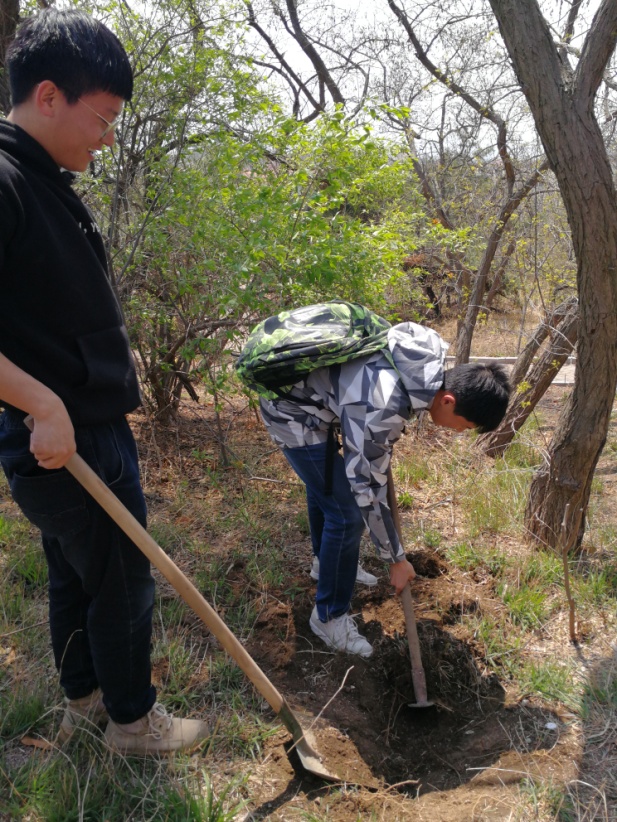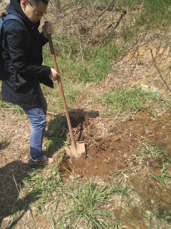 “致礼两会”植树是由班委组织发起的集体植树活动,学院为此也给予了一定的支持与鼓励,激励我们时常看护以育成参天大树;后勤集团为活动提供了四份全套的工具,铁锹、钢铲、水桶、锄具等;四株银杏树苗由班费出钱在网上购置。4月24日当天午餐结束后,在鱼山校区五号楼后八关山上,不同男女宿舍彼此组合成了四个小组,分别共同培了银杏幼苗。