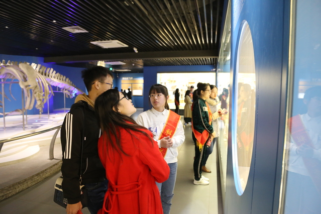 紧接着,在海洋生物标本馆科普体验日的志愿者们开始正式上岗。得益于大家积极的准备意识和事前周密的调度分工,在戴上了“科普志愿者”的绶带后,志愿者们迅速进入了角色并在负责区域就位。在志愿服务的过程中海大志愿者秩序井然、专业素质过硬。海大志愿者在做好向游客普及相关海洋知识的同时,自发地迁移到了保护海洋和海洋生物的层次,对“拥抱蓝色海洋,珍爱生命摇篮”观念的深入人心起到了模范带头作用,从中展现出海大学子的良好风貌并赢得了游客和水族馆的一致赞誉。