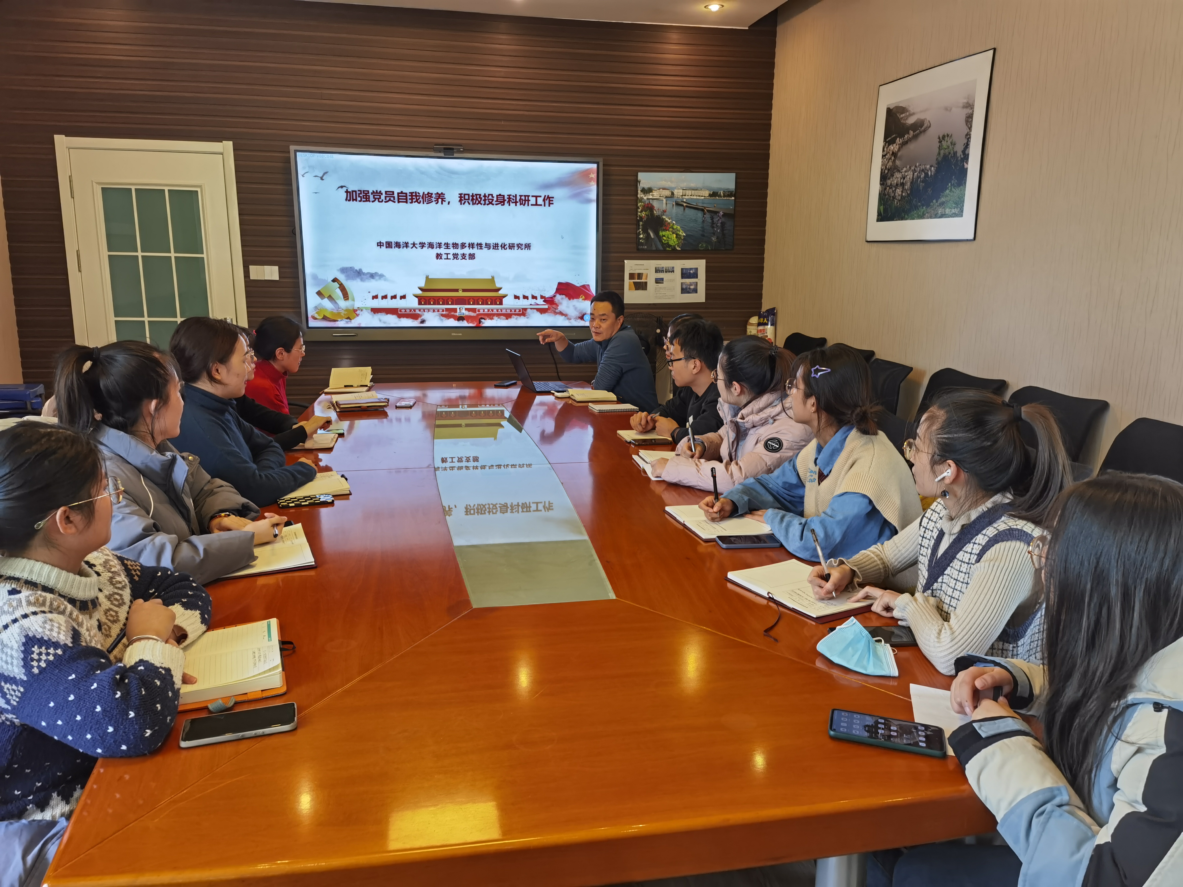 2021 年 12 月 1 日下午,2019 级水生生物硕士研究生党支部开展对话党员导师主题党日活动。会议由支部党员导师马洪钢老师主持,全体党员出席。
