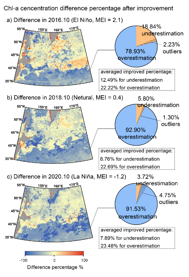 本研究通过结合西北太平洋实地调查数据,针对该区域进行遥感叶绿素数据的改进以及多源卫星数据的融合,在最终叶绿素产品的准确性以及覆盖率上都得到了较为显著的提升(图1)。进一步结合渔业作业点位数据、海洋气候及环境数据分析发现,改进后的叶绿素产品数据分布同黑潮延伸体具有较强的相关性,同时,渔业作业点的分布也与海温及叶绿素锋面十分吻合(图2);改进后的叶绿素产品数据与中尺度涡旋的分布也呈现出相应的分布特点(图3);在不同ENSO气候模式下,改进后的叶绿素产品数据对于改进前的数据有着不同的响应特点,能够更准确地反应出西北太平洋海区在不同气候背景下叶绿素的分布情况(图4)。研究为渔业及海洋学在西北太平洋海区的相关研究提供了更为精确的数据支持,为渔业资源变动及海洋学变化的解释提供了可靠的依据。