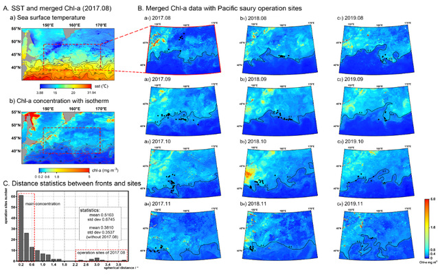 7月28日,国际遥感top期刊《RemoteSensing》在线刊登了开云电竞网址渔业海洋学实验室关于渔业遥感方面的最新研究成果“Improvement and Assessment of Ocean Color Algorithms in the Northwest Pacific Fishing Ground Using Himawari-8, MODIS-Aqua and VIIRS-SNPP”。该研究通过对三颗卫星的水色遥感数据算法在西北太平洋海域的表现进行区域性改进及后续评估,显著的改善了遥感叶绿素数据在西北太平洋区域的数据准确性以及覆盖率,进一步结合渔业作业点及海洋环境数据发现,叶绿素锋面同黑潮延伸体温度锋面以及秋刀鱼渔业作业点在空间上高度重合;同时,改进后的叶绿素数据对于中尺度涡旋以及ENSO气候具有更为灵敏的响应。因此,基于改进的遥感叶绿素产品,研究从海洋叶绿素时空变动角度,对西北太平洋渔场资源变动及气候和海洋学现象影响机制的研究有重要意义。