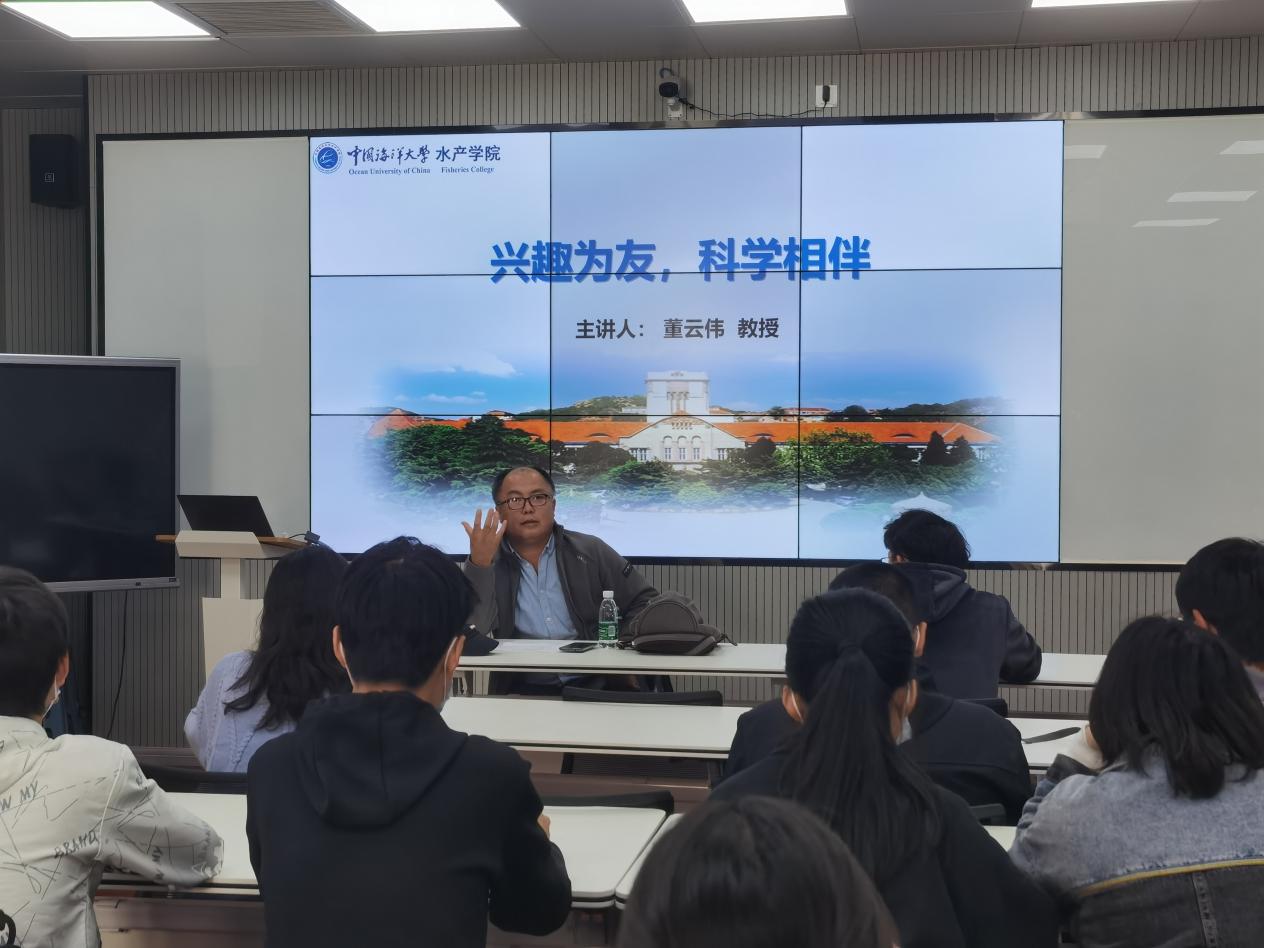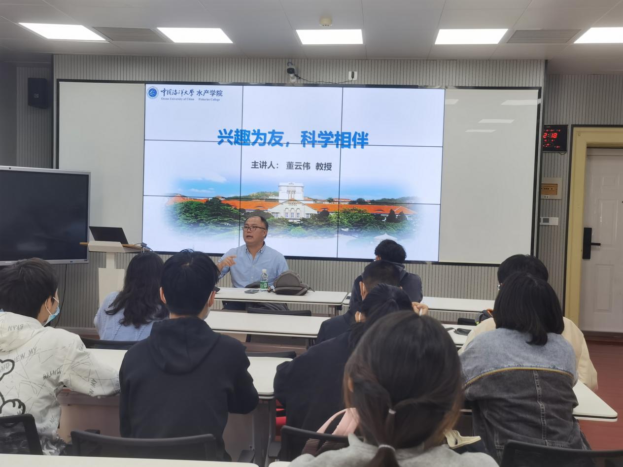 董云伟教授以“兴趣为友,科研相伴”为主题开展分享。董老师表示,青年人要树立远大理想抱负,在持续奋斗和不断探索中找到自己的梦想,在历史的漫漫长河中留下自己的足迹。就水产学子而言,我们要珍惜学校学院提供的科研平台,在浓郁的学科环境中汲取养分,增强海大水产人的自豪感和使命感,从前辈的手中接过历史接力棒,为我国水产事业的发展贡献力量,“确保中国人的饭碗牢牢端在自己手中”。