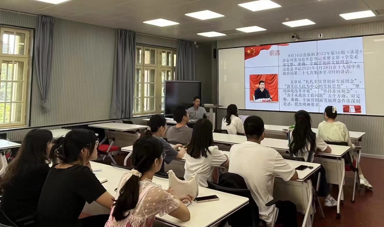 2022年9月2日,2020级水生生物硕士研究生党支部指导老师井爱国带领支部党员深入学习领会习近平总书记重要文章《全党必须完整、准确、全面贯彻新发展理念》,并对研三学生如何开始新学期生活提出了建议。