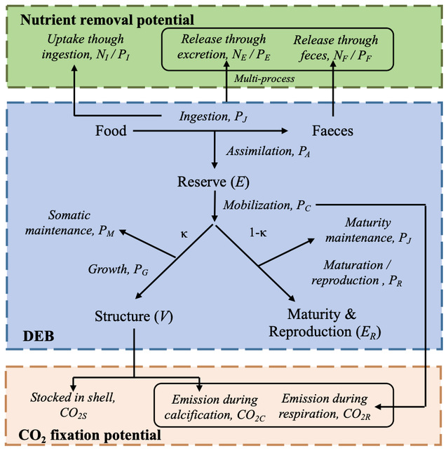 图1 硬壳蛤移除氮磷和固定CO2的生物修复潜力评估模型概念图