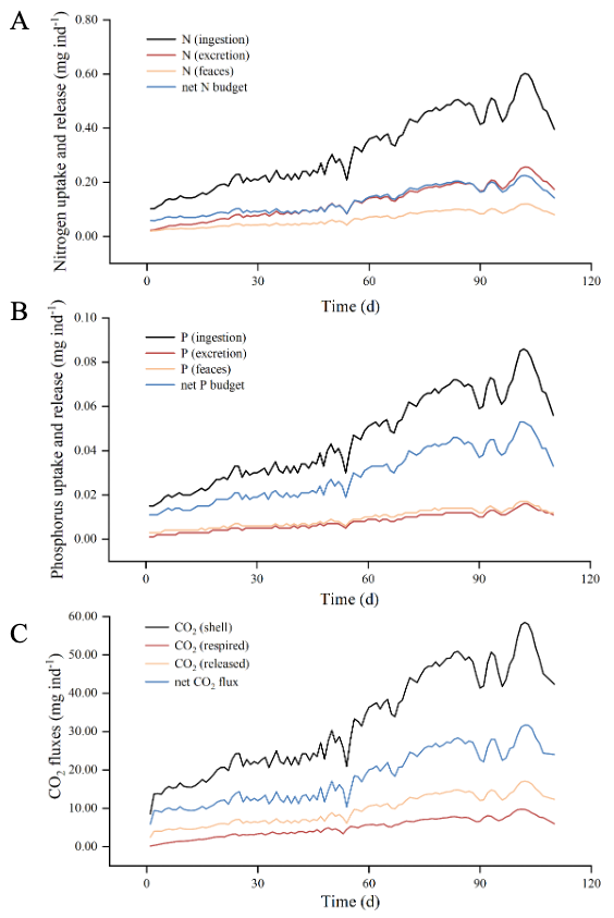 图2硬壳蛤对对虾集约化养殖水体中氮(A)、磷(B)和CO2(C)影响的模拟