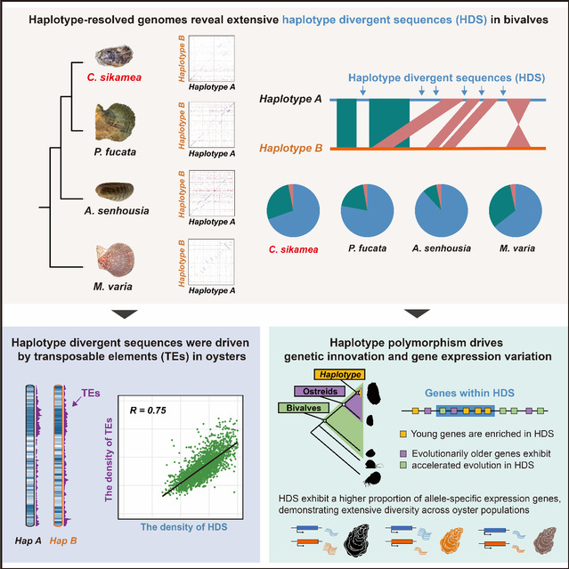 近日,水产学院贝类遗传育种团队李琪教授、刘士凯教授联合英国爱丁堡大学合作者在双壳贝类基因组多样性研究领域取得重要进展。相关成果以“Haplotype-resolved genomes provide insights into the origins and functional significance of genome diversity in bivalves(单倍型解析基因组揭示双壳贝类基因组多样性的起源与功能意义)”为题,在Cell Reports期刊上在线发表(https://doi.org/10.1016/j.celrep.2025.115697)。