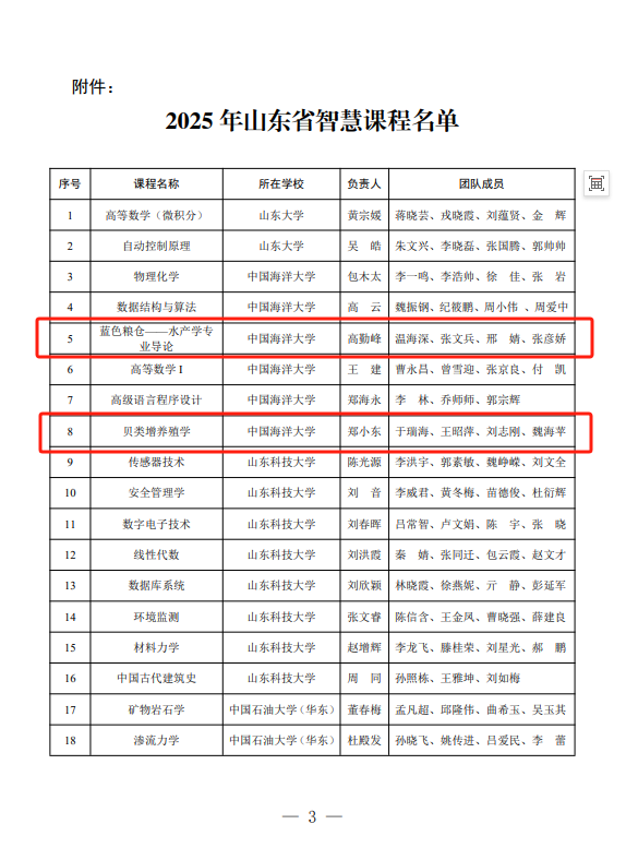 近日,山东省高等教育学会、山东省高等学校课程联盟公布了2025年山东省智慧课程认定结果,水产学院2门课程成功入选,标志着我院在人工智能赋能教学改革、深化智慧课程建设方面取得了实质性进展。