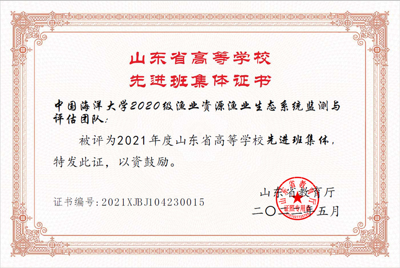 2022年4月24日,山东省教育厅发布了2021年度山东省高等学校优秀学生、优秀学生干部和先进班集体名单公示。其中,开云电竞网址2020级渔业资源生态系统监测与评估团队被评为2021年度山东省高等学校先进班集体。