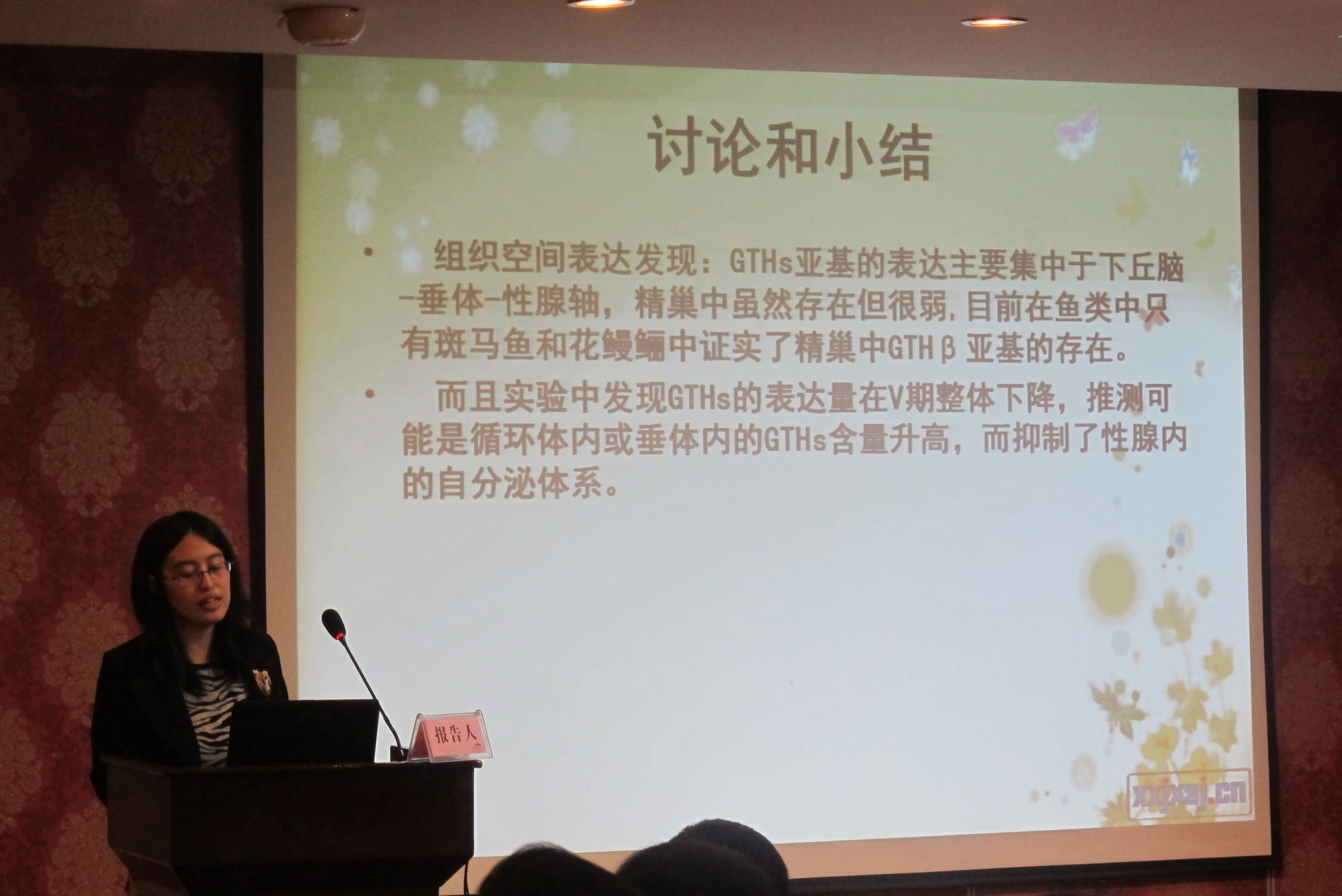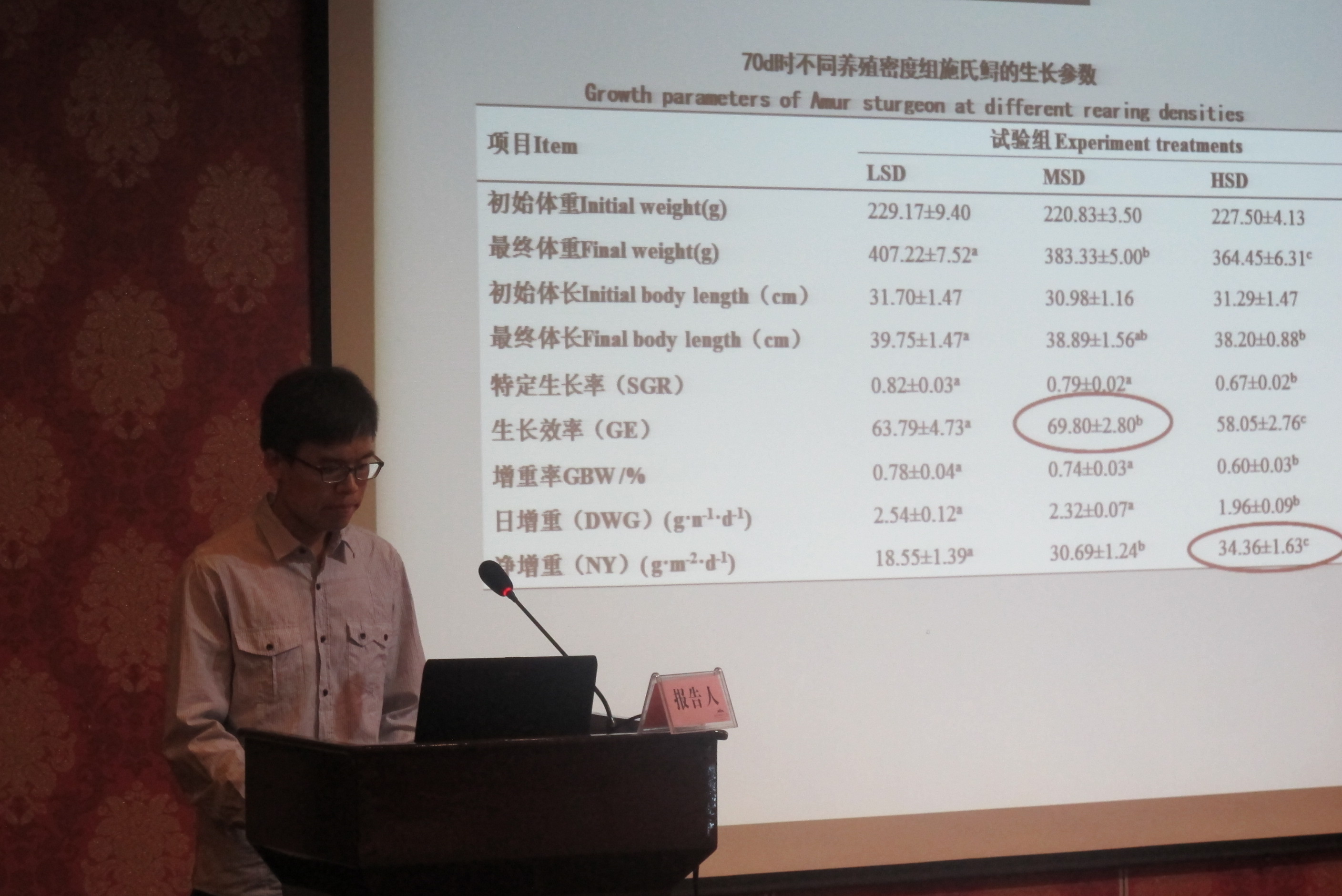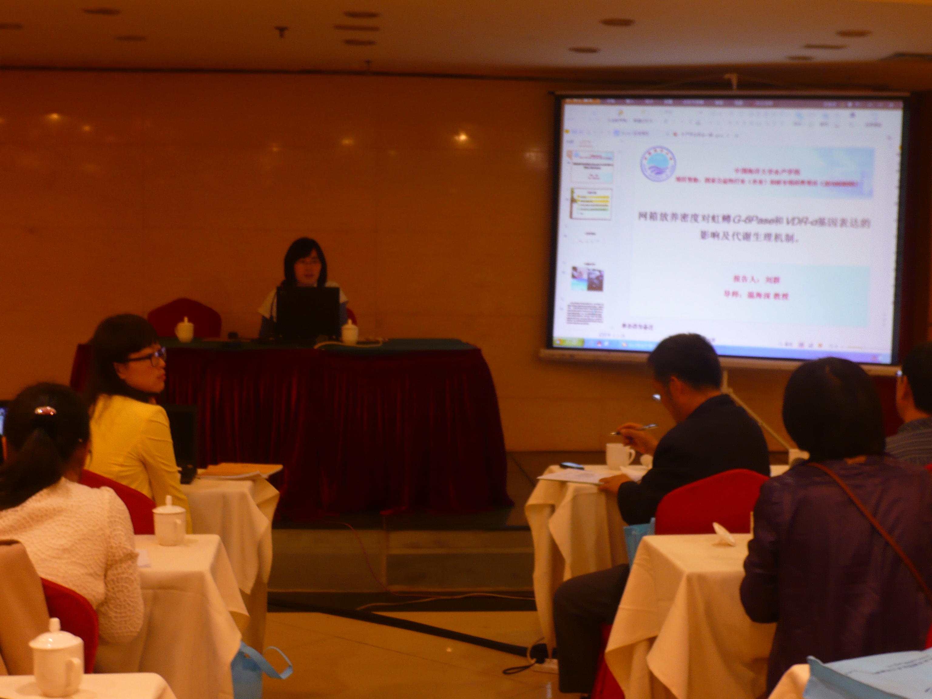实验室刘群博士所做《网箱放养密度对虹鳟G-6Pase和VDR-α基因表达的影响及代谢生理机制》, 倪蒙博士所做《流水池塘放养密度对施氏鲟生长和免疫的影响》, 迟美丽博士所做《花鲈繁殖生理机制及其调控》 以及任源远硕士所做的《池塘放养密度对施氏鲟大规格鱼种生长发育的影响及生理机制》得到了与会专家的好评。