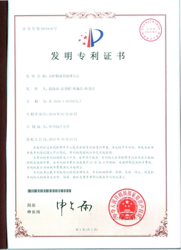 1、授权国家技术发明专利“花鲈精液处理方法”,专利号:ZL201410115175.7,授权日期:2015年10月21日。发明人:温海深,张美昭,柴森浩,韩龙江。