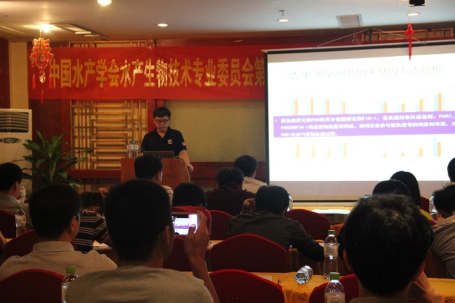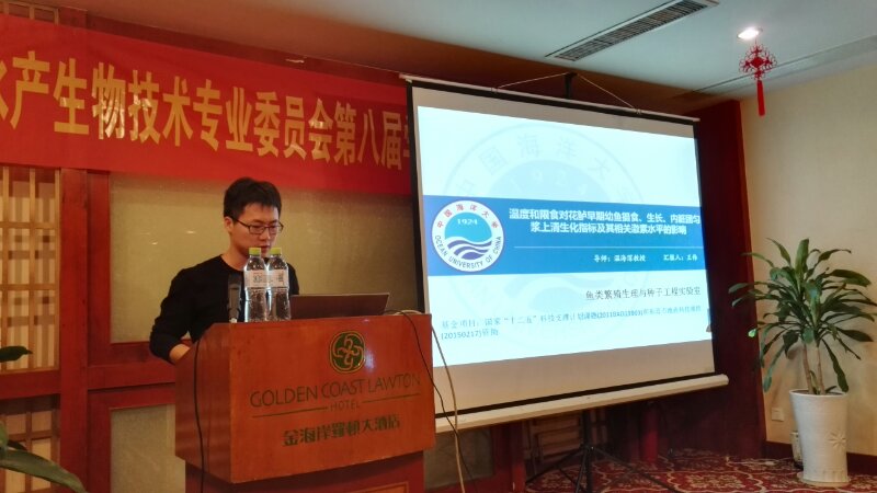 2016年10月19-21日,由中国水产学会水产生物技术专业委员会主办,南海海洋资源利用国家重点实验室(海南大学)承办,中国水产科学研究院黄海水产研究所和山东省海洋渔业生物技术与遗传育种重点实验室协办的中国水产学会水产生物技术专业委员会第八届学术研讨会在海口举行,今年年会主题是水产基因组与种业创新。大会期间邀请著名专家做大会主题报告,大会报告后进行分会场专题报告及交流。实验室温海深教授、李吉方副教授、何峰讲师、张美昭高级工程师、李昀副教授,2位博士研究生和2位硕士研究生出席会议,温海深教授、何峰讲师与4位研究生分别做了大会交流报告。 1、温海深:卵胎生鱼类繁殖生理机制研究 2、何峰:鲆鲽鱼类经济性状相关基因组表观遗传学分析 3、任源远:西伯利亚杂交鲟响应低氧胁迫的生理及分子机制初步研究 4、张晓燕:不同盐度条件下花鲈肝脏转录组学特性的初步研究 5、王伟:温度和限食对花鲈(Lateolabrax maculatus)早期幼鱼摄食与生长的影响 6、赵吉:急性温度变化下雄性许氏平鮋血清代谢组的变化