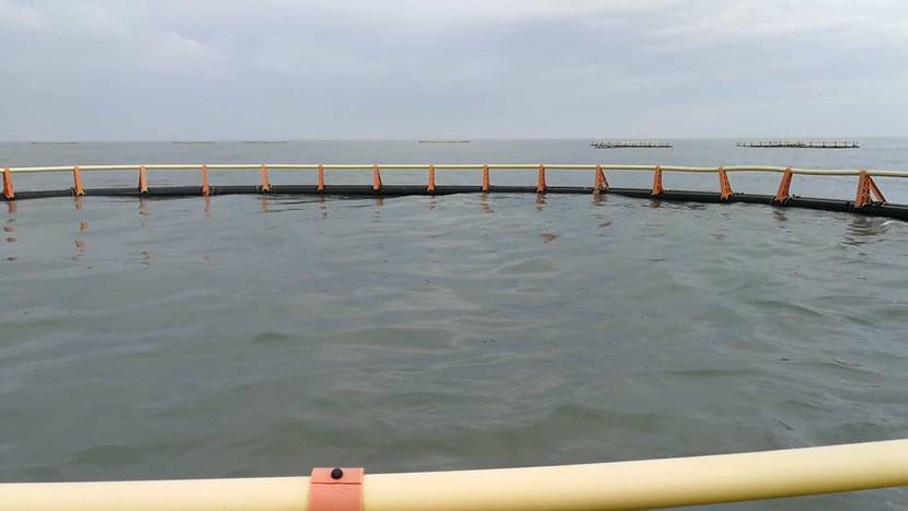 2018年5月22日,开云电竞网址水产学院鱼类繁殖生理与种子工程实验室老师张美昭、齐鑫,与东营市鲁鑫海洋开发有限责任公司董事长张大伟,一同对位于利津刁口乡北部海域的80米周长的深水网箱进行考察。此网箱呈一体式工字架,可达到抗12级台风标准。一行人主要对后续网箱的完善,养殖品种的确立进行细致商谈。为后续花鲈深海网箱养殖奠定一定基础。