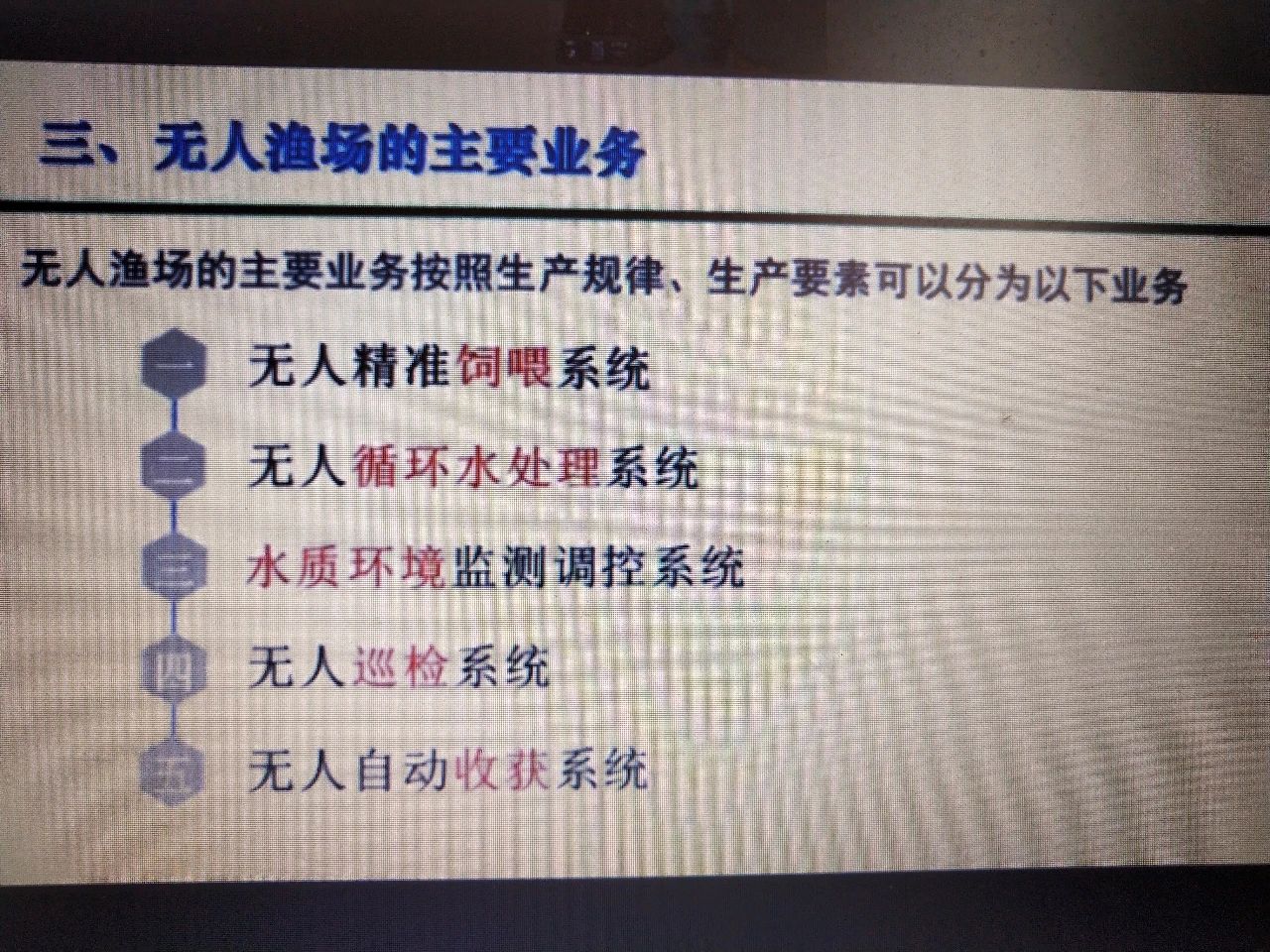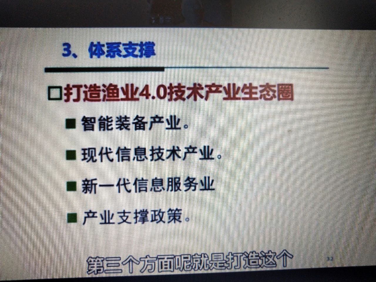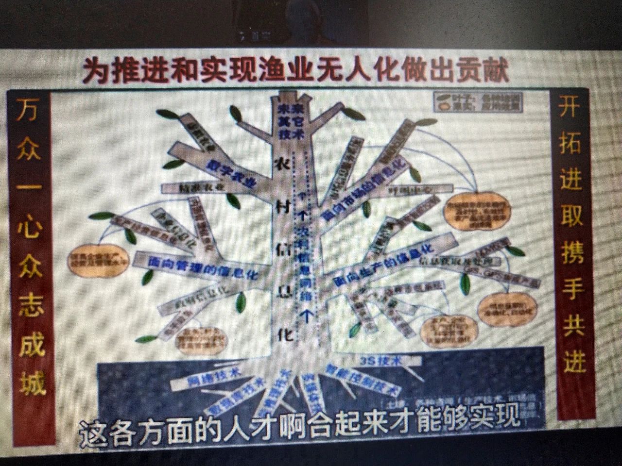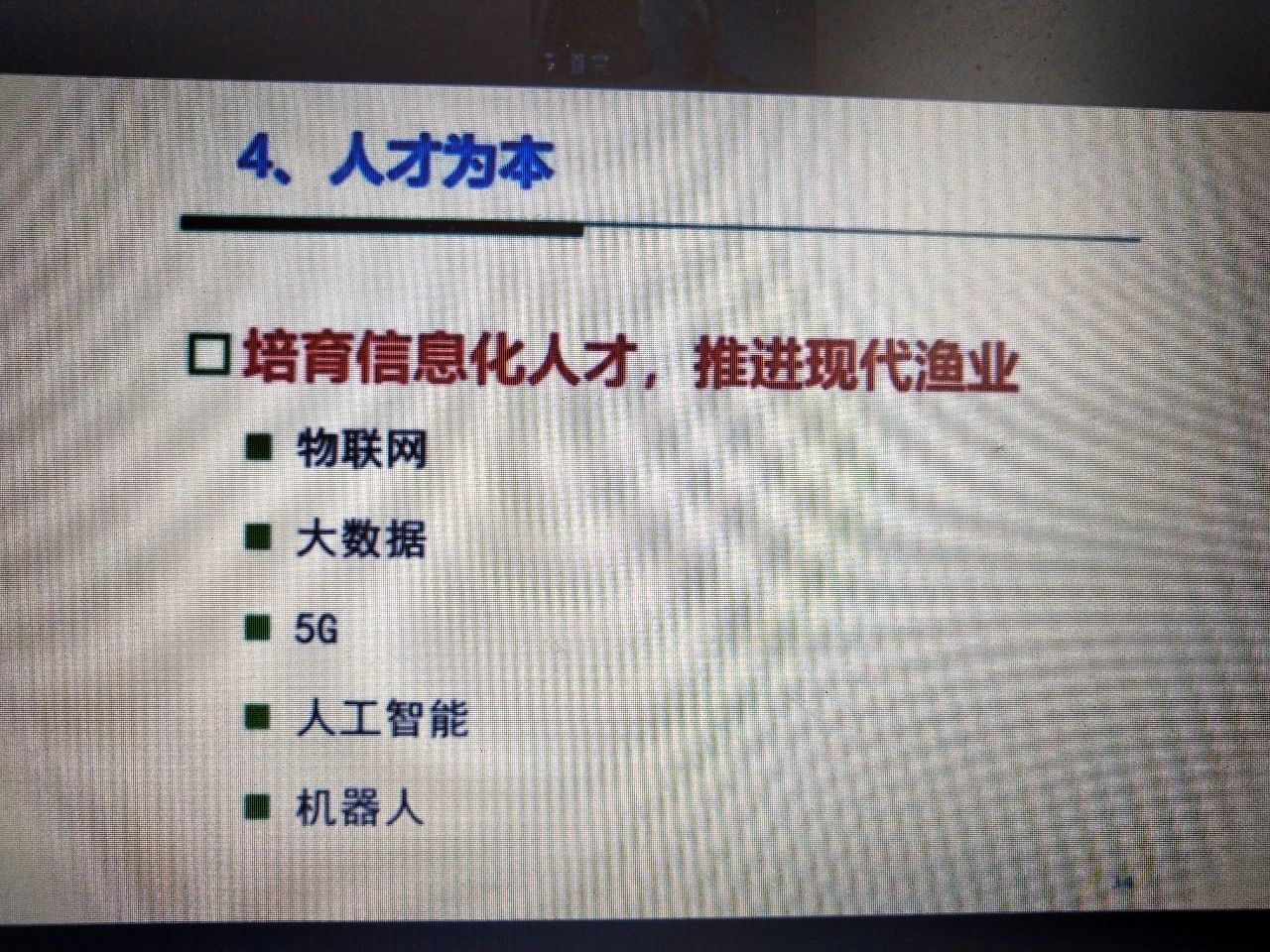 培育信息化人才,推进现代渔业。 这里面涉及到物联网、大数据、5G、人工智能、机器人,这里面人才的培养是最重要的。通过人才的培养来推进无人渔场的实施。