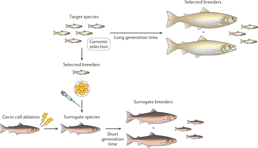 樱鳟(Oncorhynchus masou) 图片来自FishBase 大西洋蓝鳍金枪鱼(Thunnus thynnus)的繁殖问题一直是个挑战,可将其生殖细胞注入到日本鲭(Scomber japonicus)中获得金枪鱼的后代。代孕技术还可与原始生殖细胞的基因编辑技术相结合来创建育种系,这已在鸡的不同品种上得到成功验证。虽然将“借腹生子”技术、基因组编辑和基因组选择技术的结合是一项长期且高风险的研究,但这种结合可能会通过缩短世代间隔大幅提高育种中的遗传增益速率。