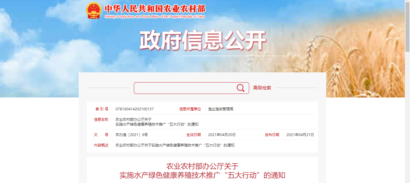 2020年,农业农村部组织实施水产绿色健康养殖“五大行动”,各级渔业行政主管部门及水产技术推广机构积极响应,采取有力措施推进实施,取得了积极成效。全国共培育“五大行动”骨干基地926个,推广生态健康养殖模式9个,实现养殖尾水资源化综合利用或达标排放,水产养殖用兽药使用量同比减少5.93%,配合饲料替代率平均达到73.5%,示范推广水产新品种(新品系)98个,全面完成2020年各项行动目标任务。 进一步贯彻落实党的十九届五中全会关于推动绿色发展、加快发展方式转型升级的战略部署和2021年中央一号文件“推进水产绿色健康养殖”的部署要求,4月20日,农业农村部办公厅印发《关于实施水产绿色健康养殖技术推广“五大行动”的通知》(农办渔〔2021〕6号),决定在“十四五”期间进一步实施生态健康养殖模式示范推广、养殖尾水治理模式推广、水产养殖用药减量、配合饲料替代幼杂鱼和水产种业质量提升等水产绿色健康养殖技术推广“五大行动”(以下简称“五大行动”),并对该项工作进行了部署,明确由全国水产技术推广总站负责牵头组织“五大行动”实施工作。 为做好实施工作,全国水产技术推广总站同日印发《关于做好2021年水产绿色健康养殖技术推广“五大行动”实施工作的通知》(农渔技办〔2021〕12号),要求各地水产技术推广部门提高思想认识,将实施“五大行动”作为水产技术推广工作的重点任务抓实抓好;细化目标任务,确保“五大行动”扎实有效实施并取得新进展新成效;强化工作落实,切实发挥“五大行动”推进水产养殖业绿色高质量发展的示范带动作用。 现将两项《通知》有关事项公布如下。