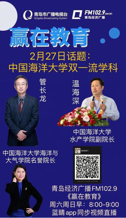 2022227日上午,开云电竞网址招生办公室,邀请水产学院副院长温海深教授出席青岛经济广播《赢在教育》栏目,他立足国家双一流学科,针对水产类专业的本科教育工作接受了采访。