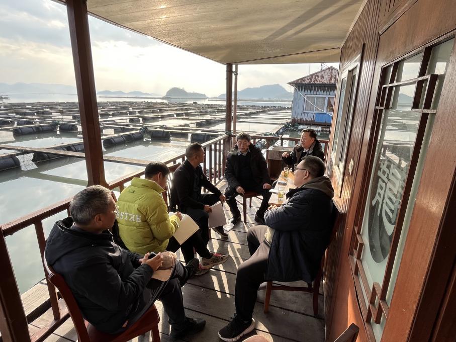 2024年1月9日,国家海水鱼产业技术体系岗位科学家温海深教授、中国科学院海洋研究所李军研究员、宁波市海洋与渔业研究院原副院长吴雄飞、国家海水鱼产业技术体系宁波综合试验站站长沈伟良工程师等一行6人前往宁波奉化市宏泰水产养殖有限公司(后简称宏泰公司)调研,主要围绕花鲈亲鱼养殖、苗种繁育等方面展开。 调研团一行首先参观了宏泰公司的养殖网箱,对养殖的花鲈养殖产量、运营模式、养殖模式、苗种繁育等方面进行调研。随后,调研团一行在养殖网箱上进行了现场座谈会,座谈会上,调研团一行同企业管理人员就寄生虫感染和弧菌感染的病害防控与治理、环境监测、花鲈亲鱼规范化管理、绿色健康养殖等方面进行了讨论,并为企业提供了有效、科学的改进意见。