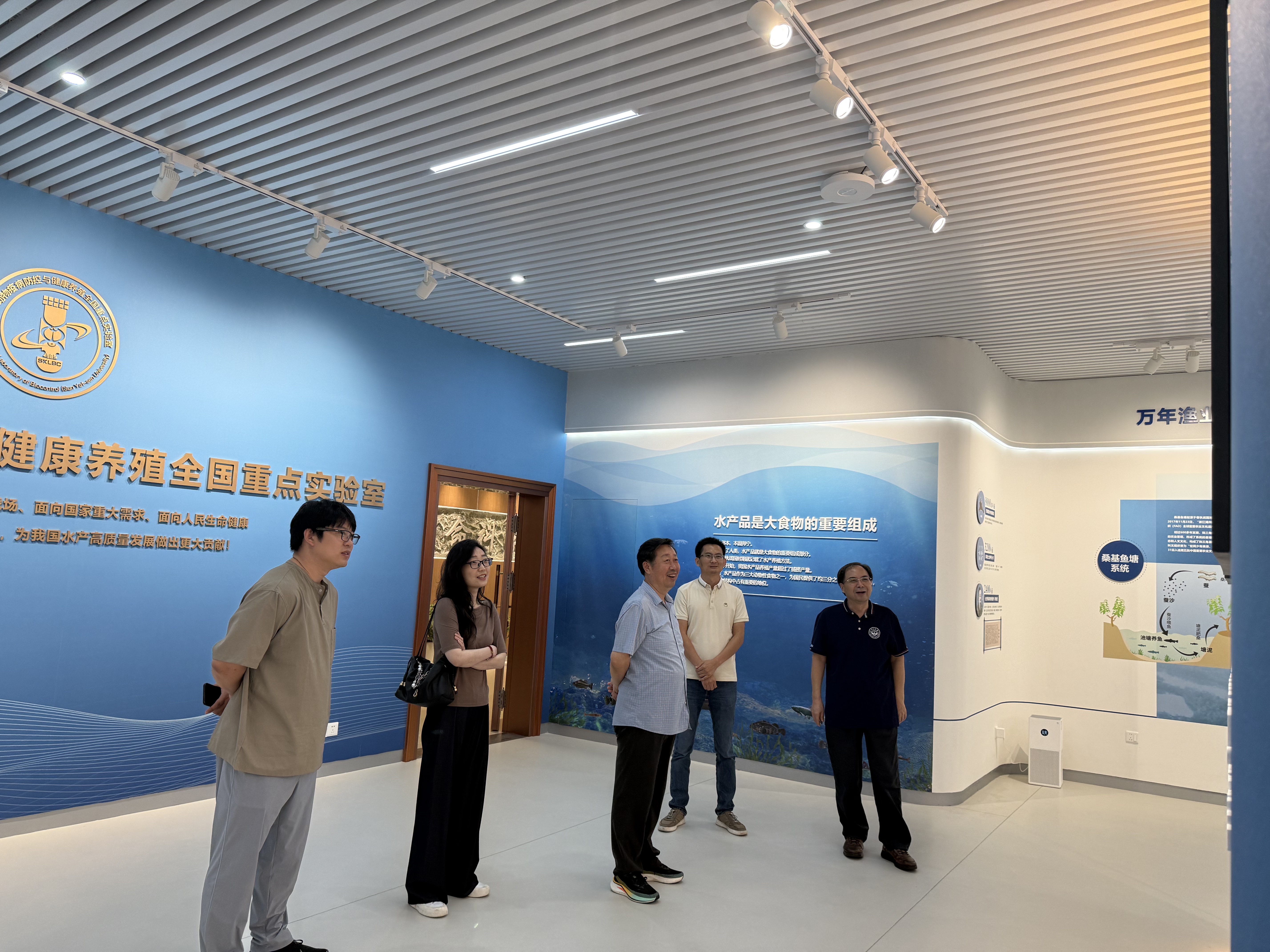 参观南方海洋实验室科普馆 8月19日上午,温海深教授一行前往农发中心进行参观交流,农发中心沈汉国主任、农发中心现代渔业研究所刘文所长、农发中心现代渔业研究所李勇副所长、农发中心现代渔业研究所何瑞鹏博士、农发中心科技管理及成果转化部罗志平副部长全程陪同。首先,李勇副所长和何瑞鹏博士陪同温海深教授一行对病害实验室进行了参观。参观后,双方进行了座谈。座谈会上,沈汉国主任对温海深教授一行表示热烈欢迎,对双方2024年度开展的花鲈本地化实验表示肯定,并指出2025年度将在总结经验教训的基础上继续开展本地化花鲈繁育研究,希望温教授团队继续支持。随后,何瑞鹏博士对农发中心基地保存花鲈亲本数量、基地设施设备、2024年度苗种培育失败原因、2025年度繁育计划进行了分享。农发中心基地保有4龄亲本800尾、3龄亲本200尾,基地建有16口池塘(100亩)、工厂化和循环车车间。最后,温教授表示将继续和农发中心保持紧密合作,需提前做好2025年度花鲈本地化繁育方案,重点关注雄鱼精液活力测定、生物饵料衔接等方面。