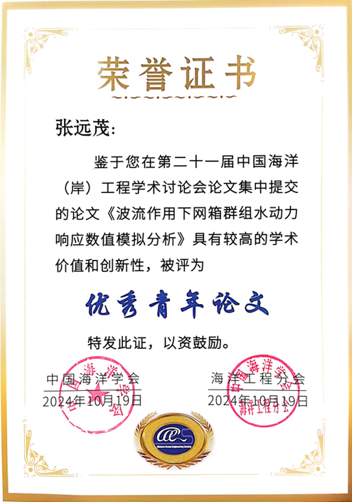 会议评选了10篇优秀青年论文,博士生张远茂提交的《波流作用下网箱群组水动力响应数值模拟分析》在150余份论文中脱颖而出,顺利当选;同时作了题为《海上风电场中网箱群组的动力响应研究》的口头报告。